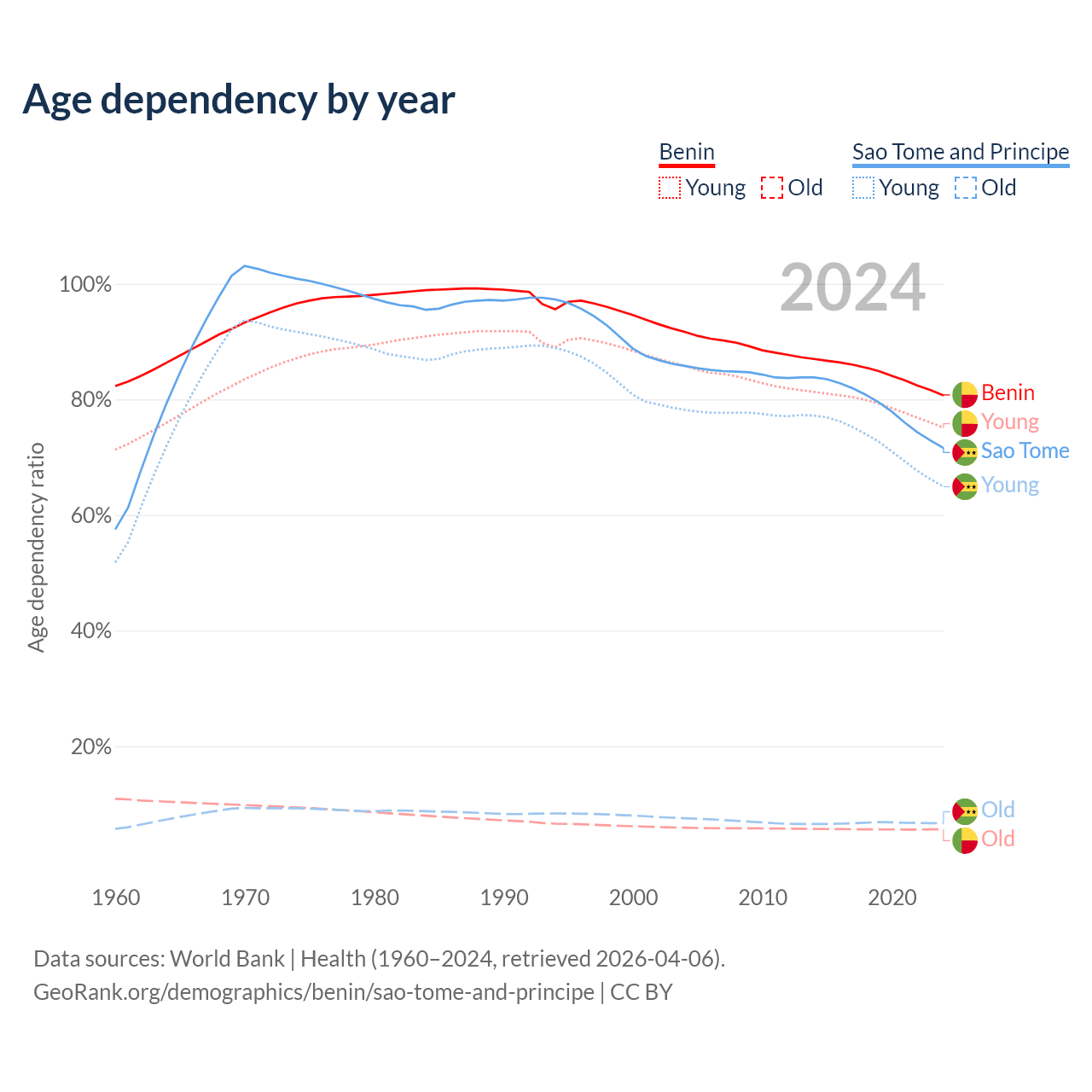 - Benin is ranked 179/196 by median age (oldest to youngest) vs 163/196 for Sao Tome and Principe.
