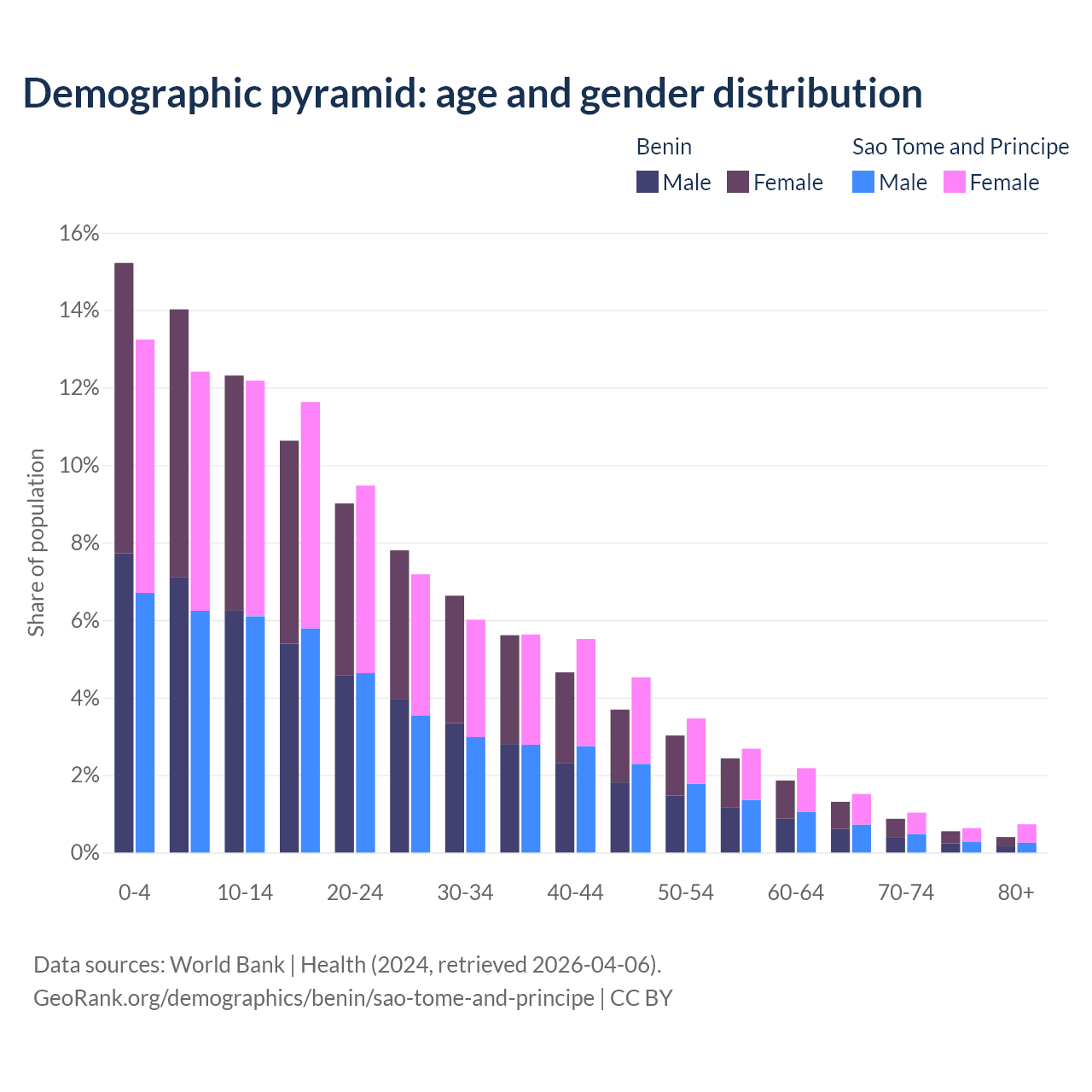- The share of young demographic (0-15 years old) in Benin is 41.6% vs 37.8% in Sao Tome and Principe.