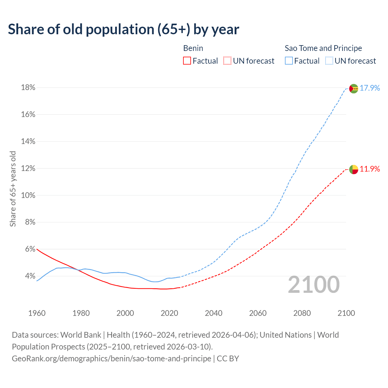 The share of older people aged 65 and over is 3.12% in Benin and 3.9% in Sao Tome and Principe. Life expectancy in Benin compared to Sao Tome and Principe .