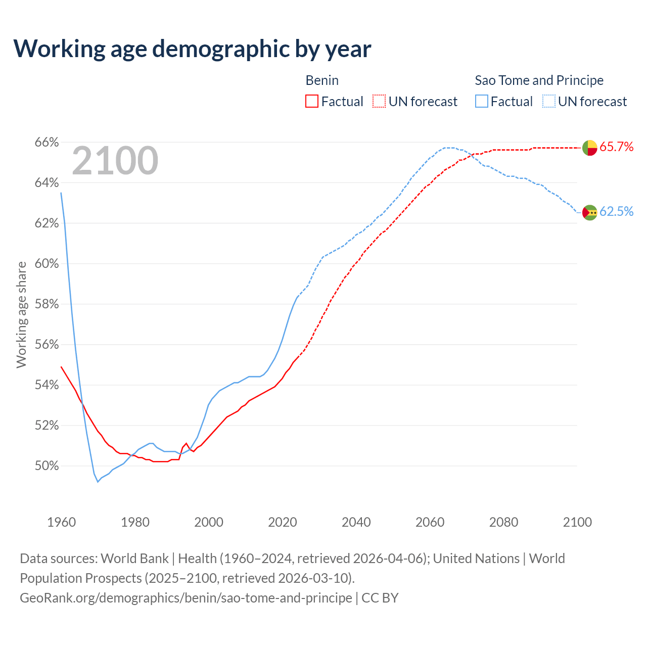 Median age Benin vs Sao Tome and Principe, 1960-2100