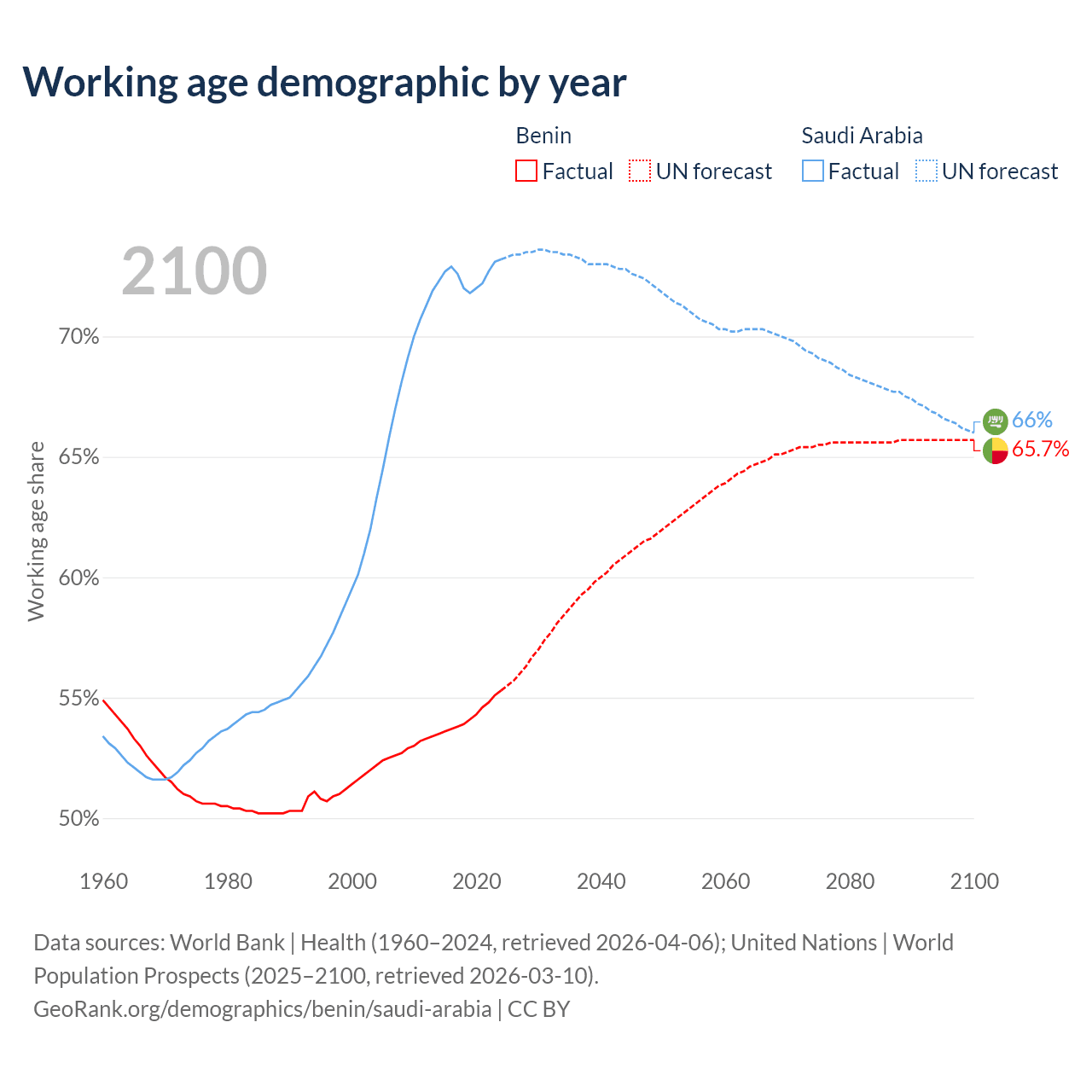 - Benin has 8.45M working age adults (aged 15-64) vs 26.9M in Saudi Arabia.