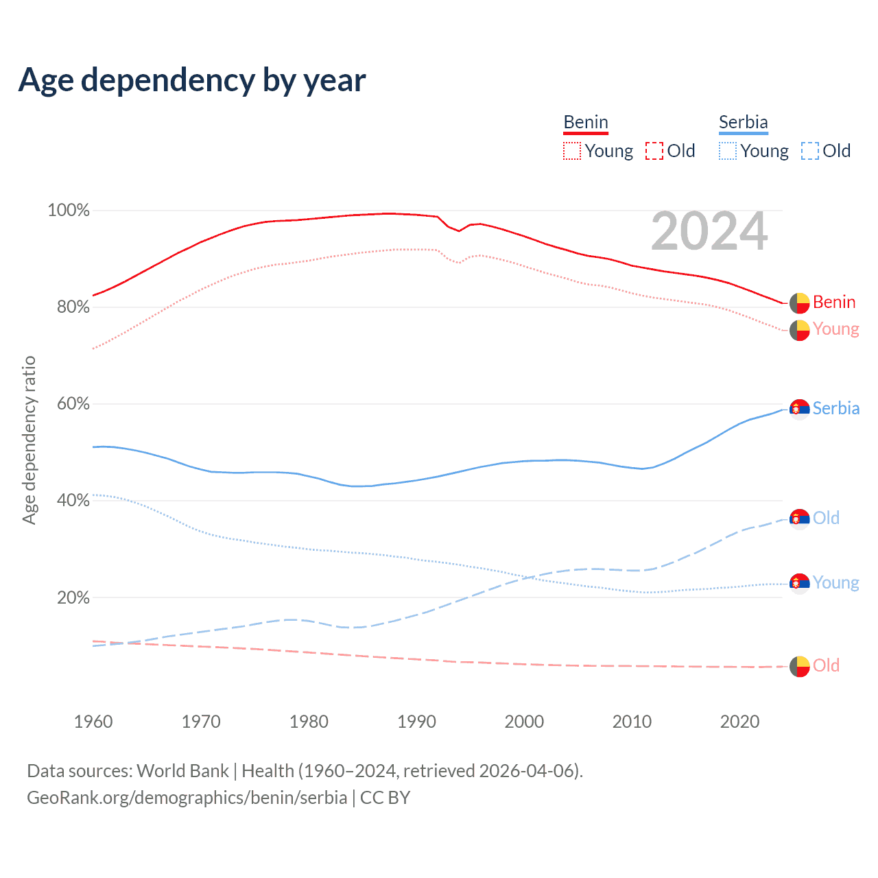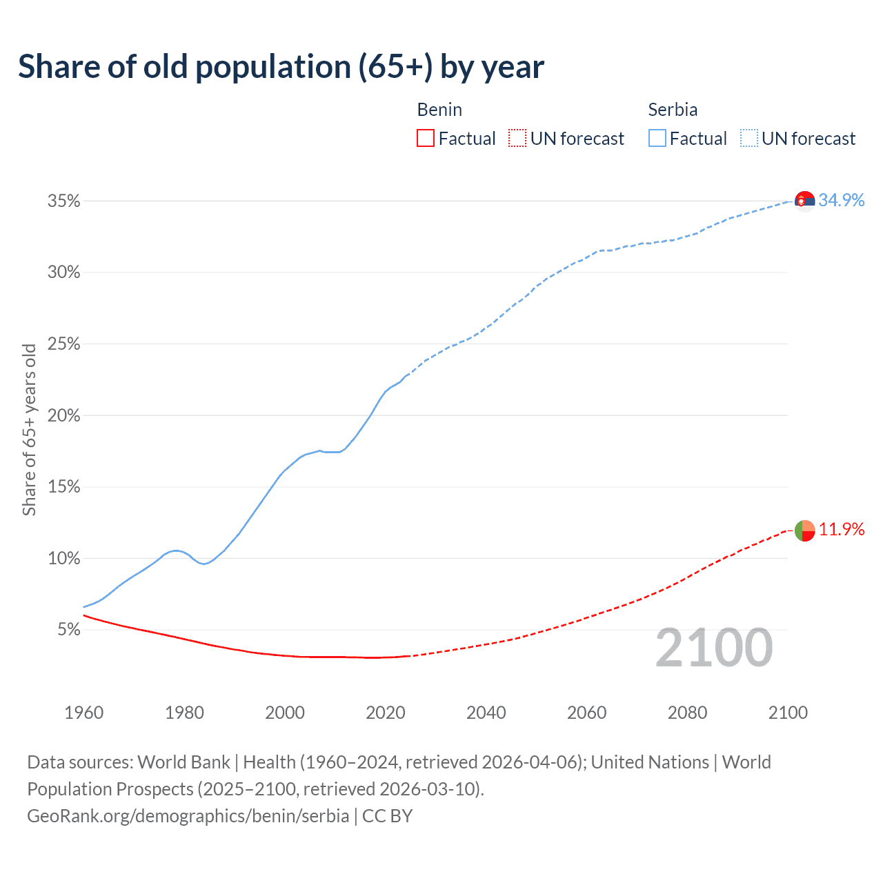 The share of older people aged 65 and over is 3.12% in Benin and 22.7% in Serbia. Life expectancy in Benin compared to Serbia .
