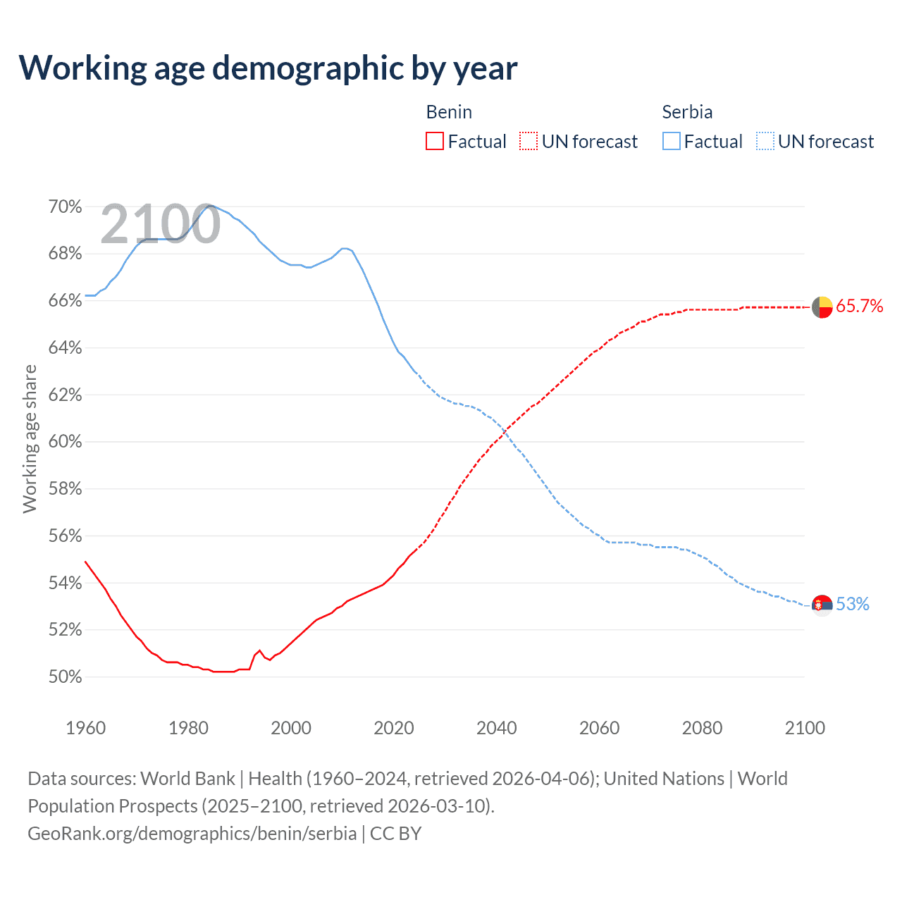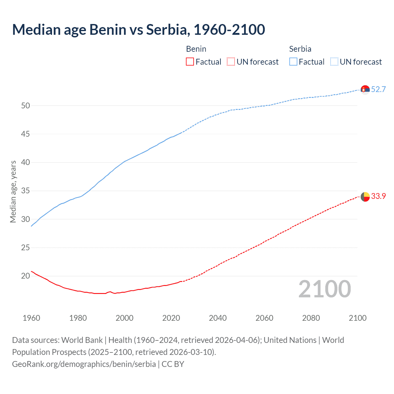 Median age Benin vs Serbia, 1960-2100