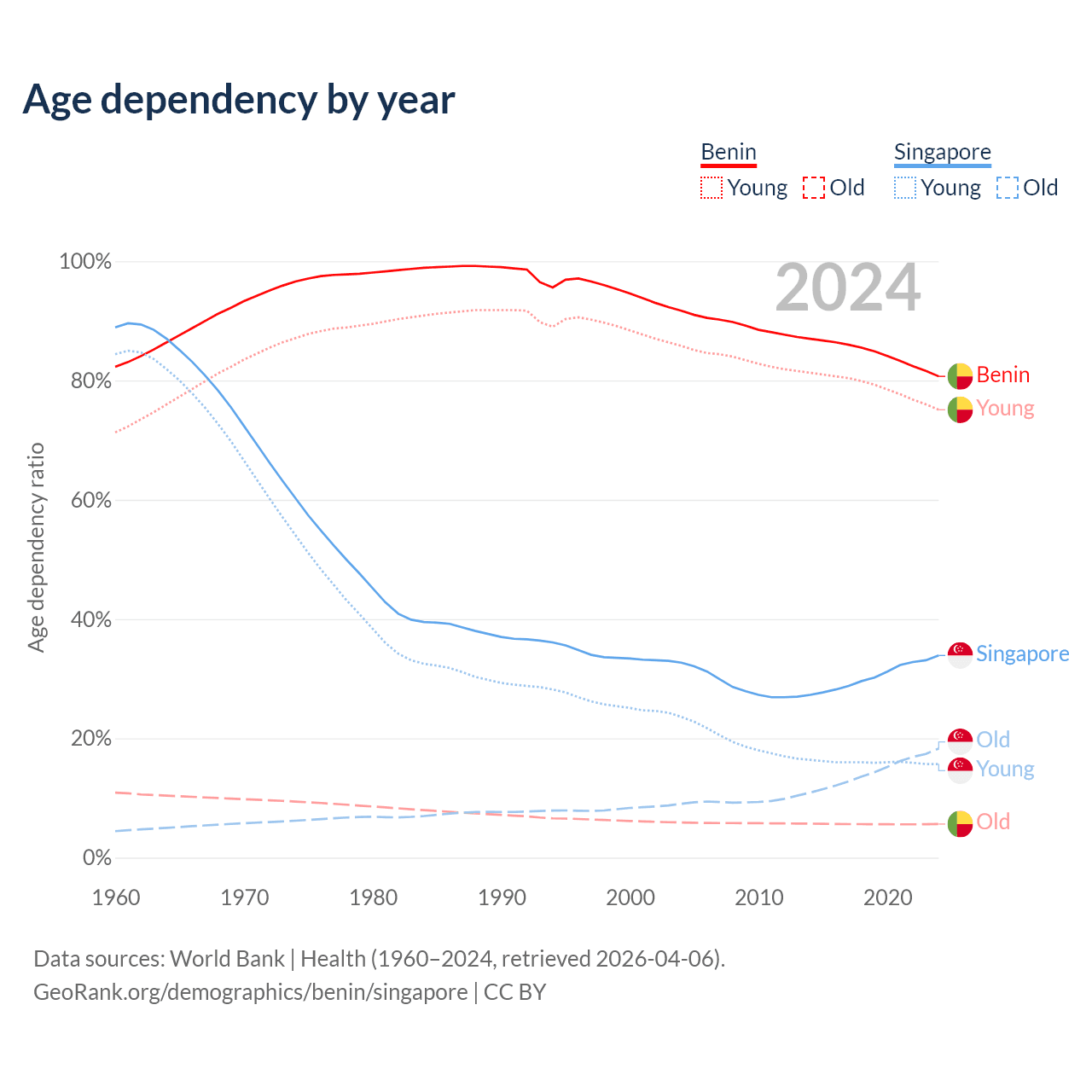 - Benin is ranked 179/196 by median age (oldest to youngest) vs 68/196 for Singapore.