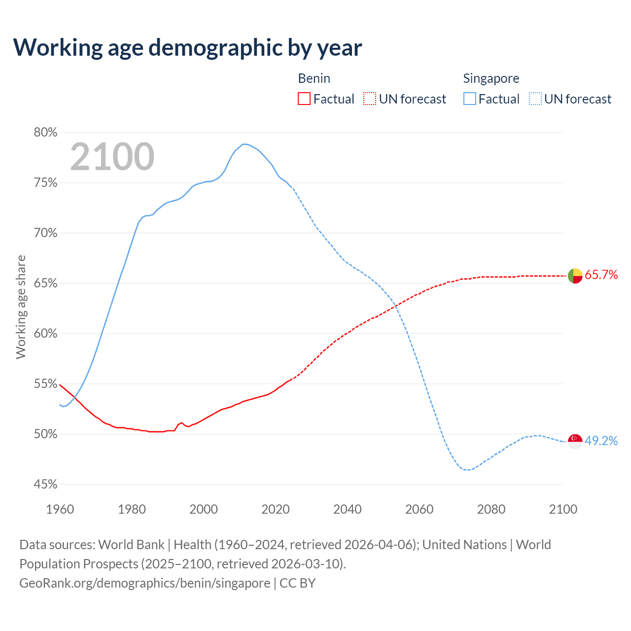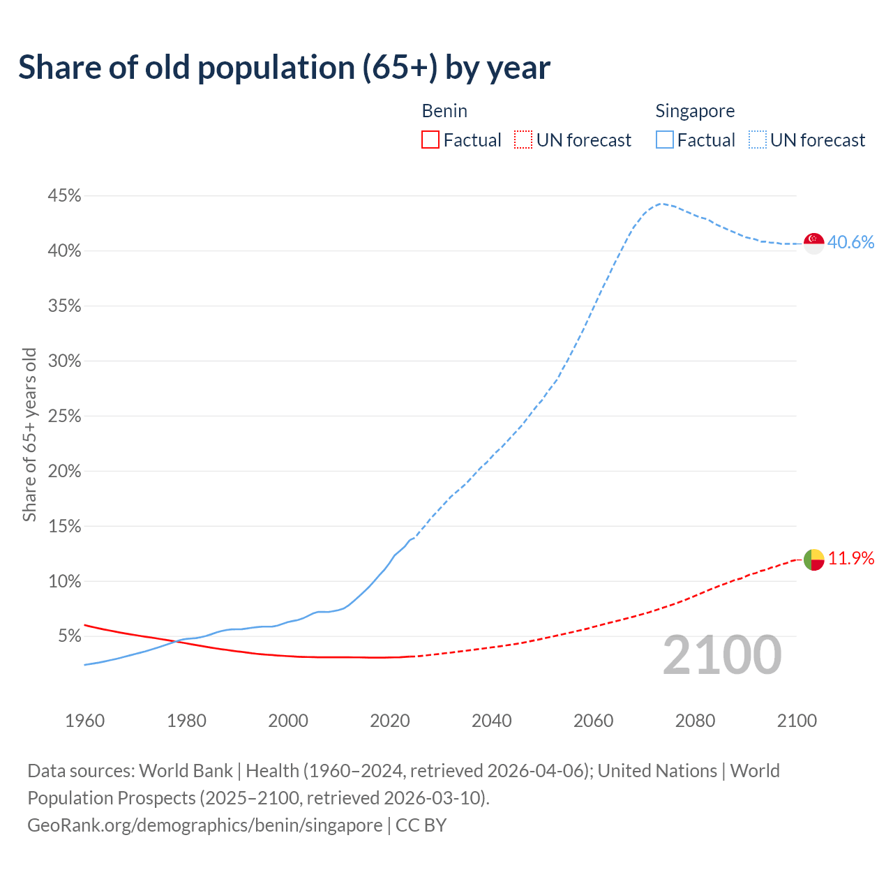 Median age Benin vs Singapore, 1960-2100