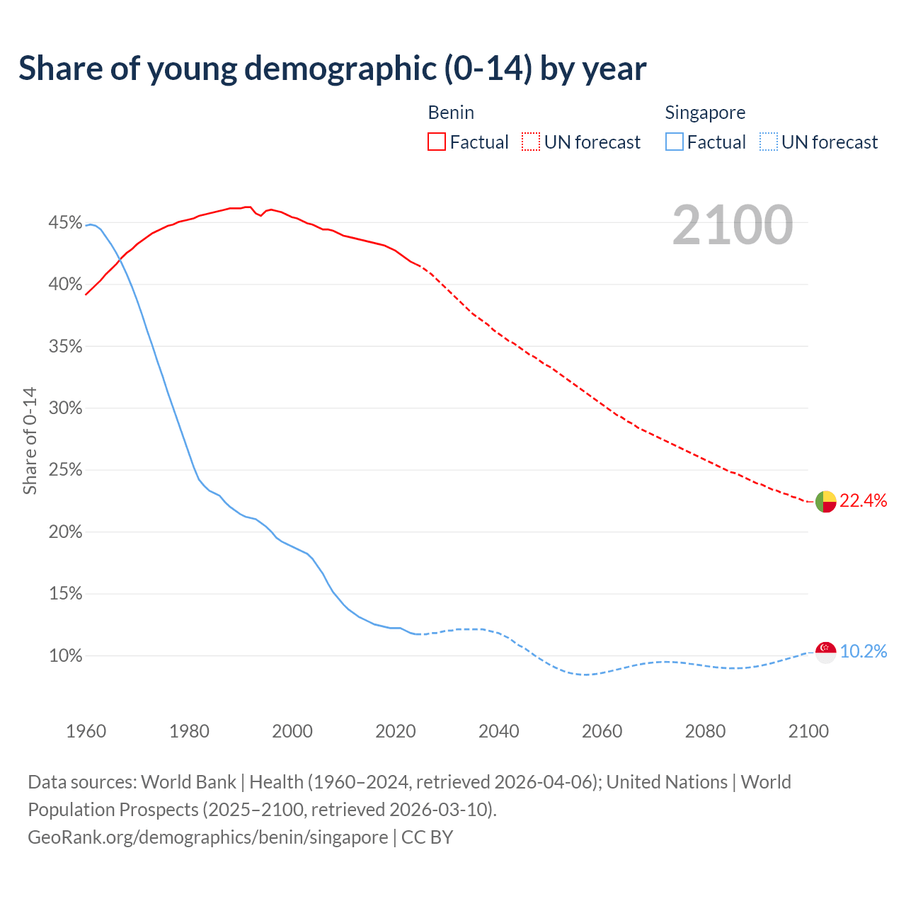 - The share of young demographic (0-15 years old) in Benin is 41.6% vs 11.7% in Singapore.