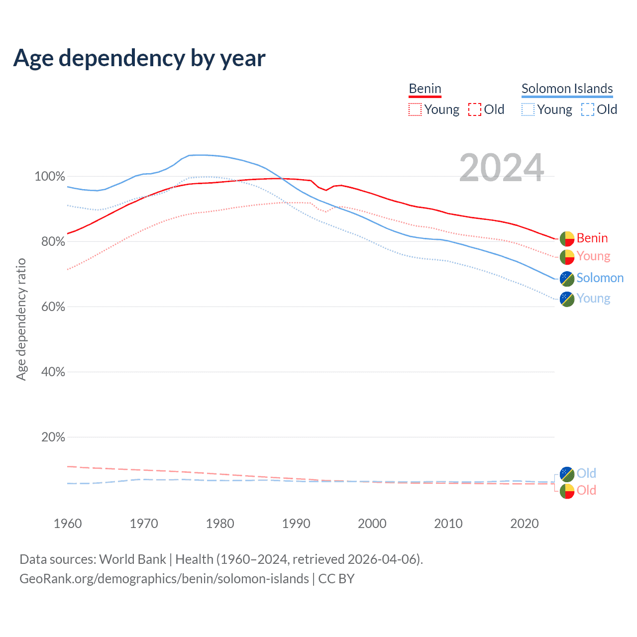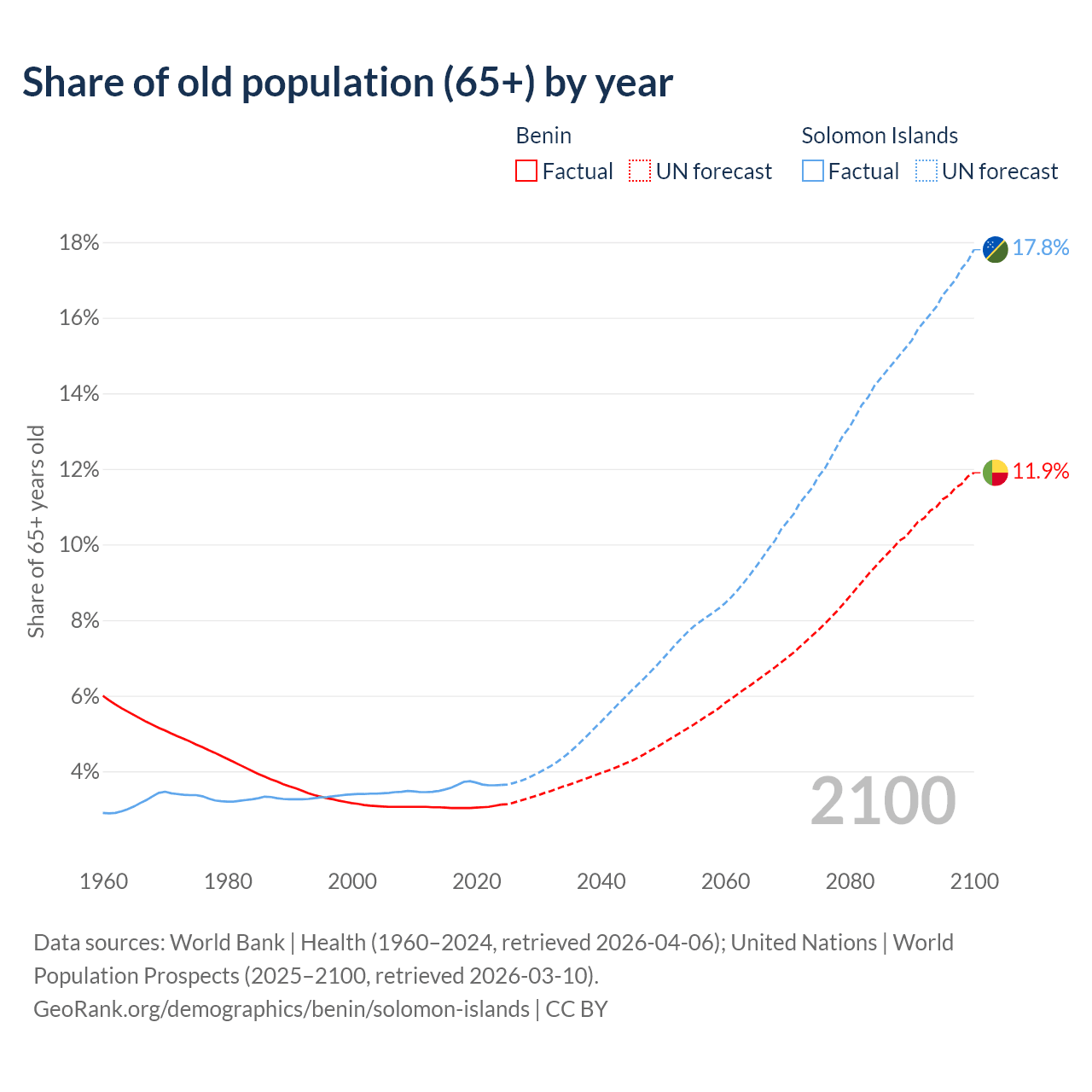 - The share of old-age demographic (65+) in Benin is 3.12% vs 3.64% in the Solomon Islands.