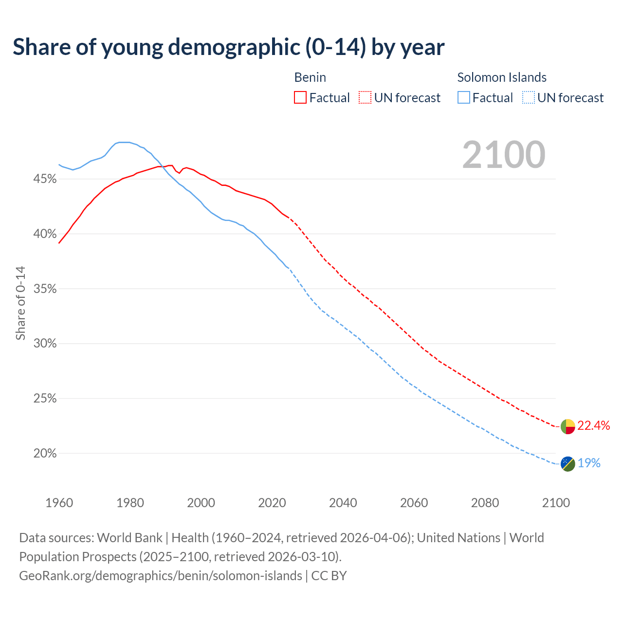 - The share of young demographic (0-15 years old) in Benin is 41.6% vs 37% in the Solomon Islands.