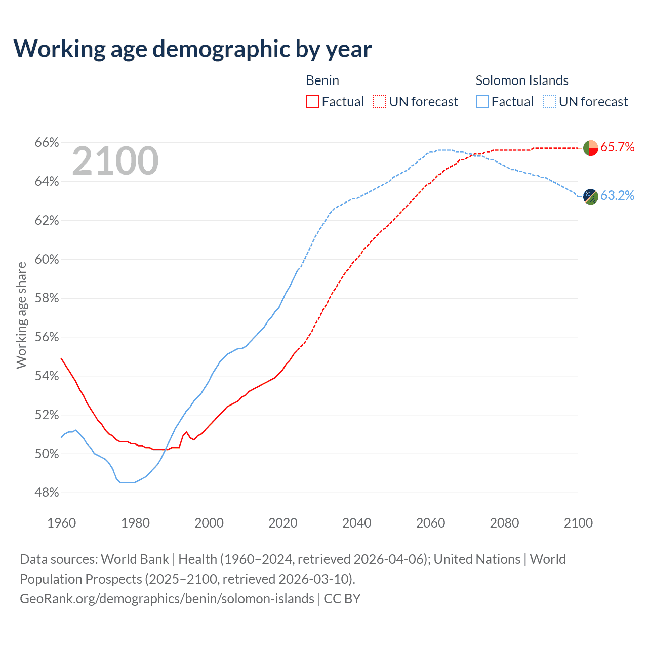 Median age Benin vs Solomon Islands, 1960-2100