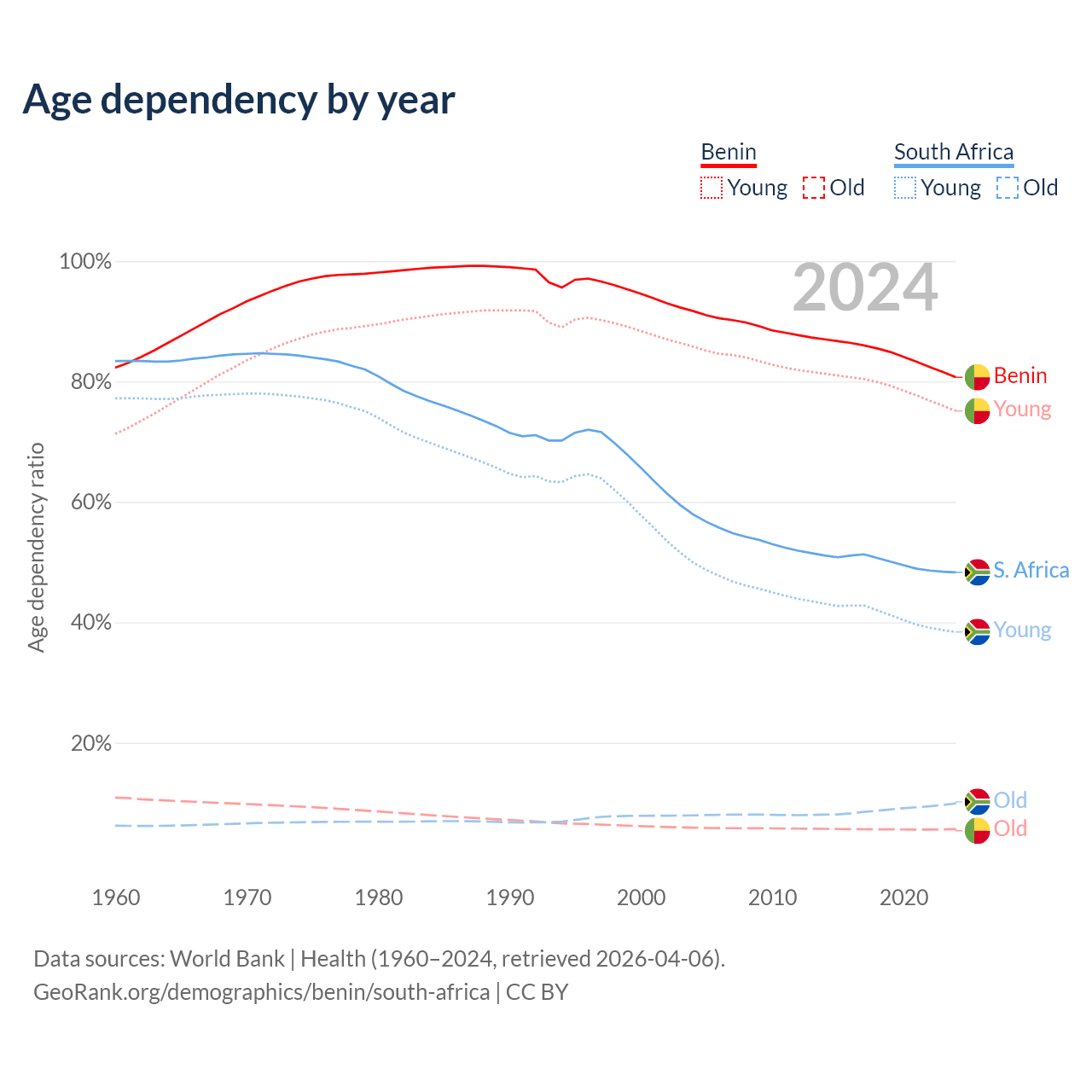 - Benin is ranked 179/196 by median age (oldest to youngest) vs 107/196 for South Africa.