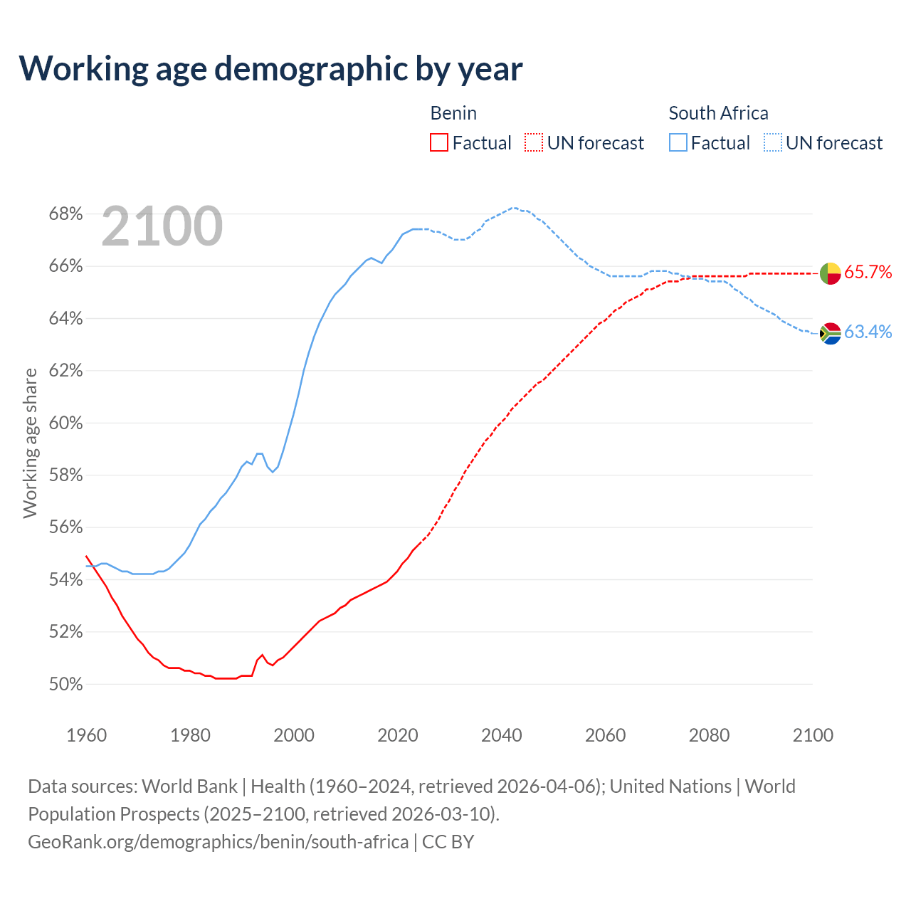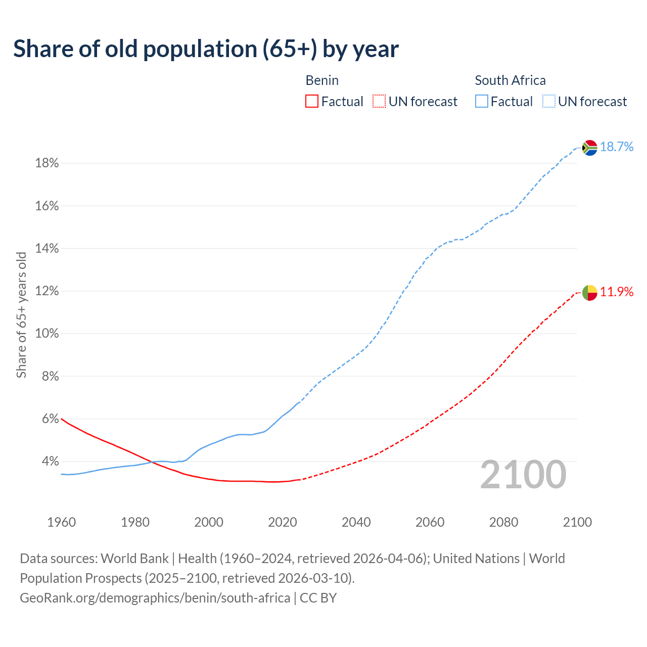 The share of older people aged 65 and over is 3.12% in Benin and 6.69% in South Africa. Life expectancy in Benin compared to South Africa .