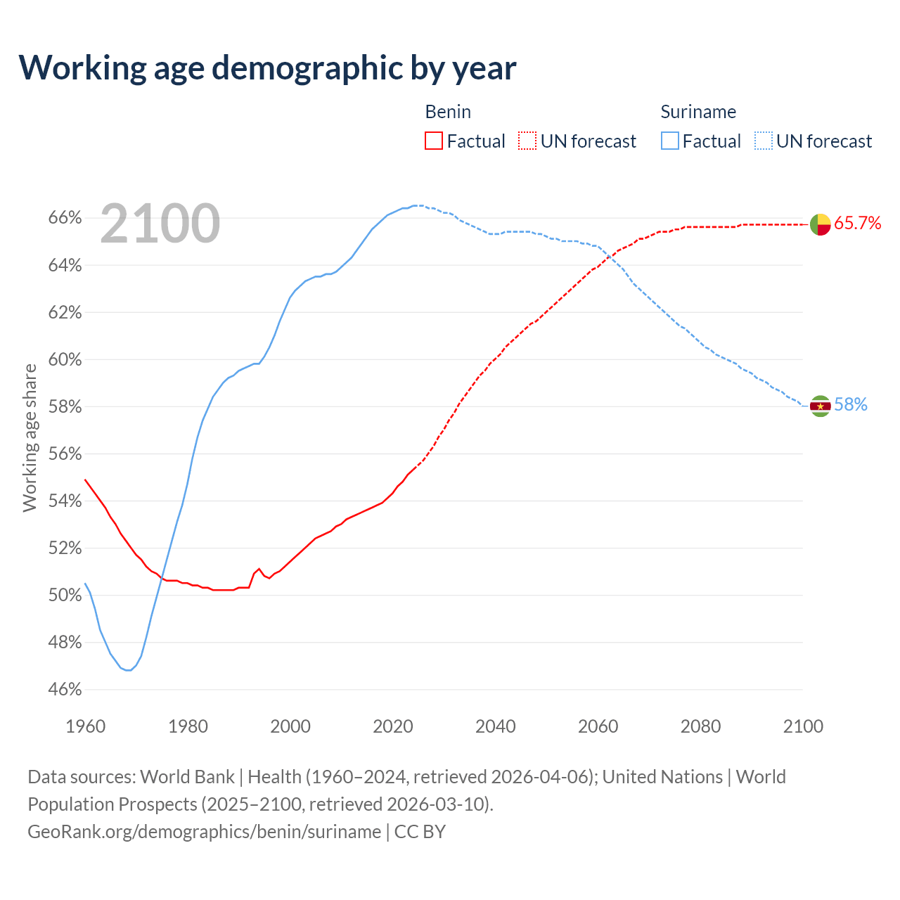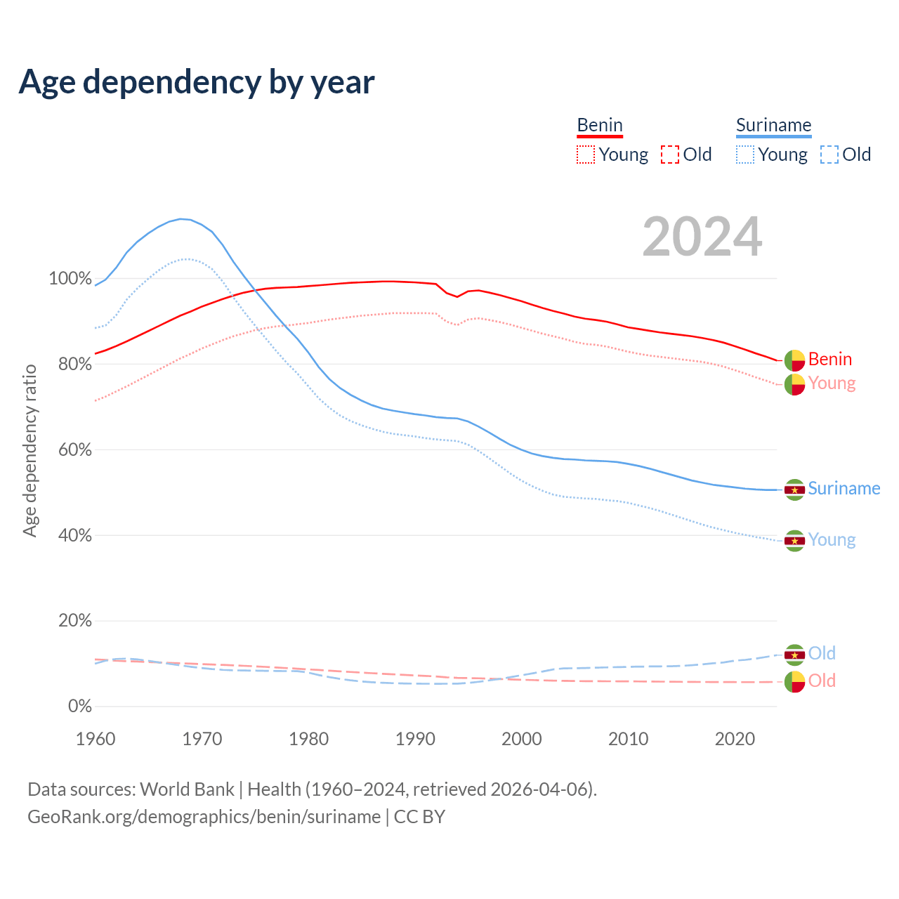 - The share of young demographic (0-15 years old) in Benin is 41.6% vs 25.6% in Suriname.
