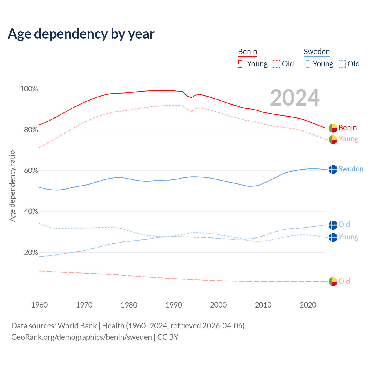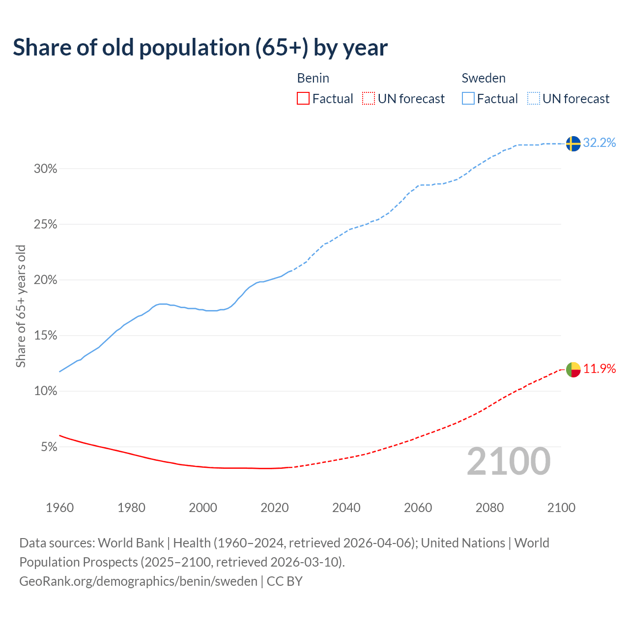 - The share of old-age demographic (65+) in Benin is 3.12% vs 20.7% in Sweden.