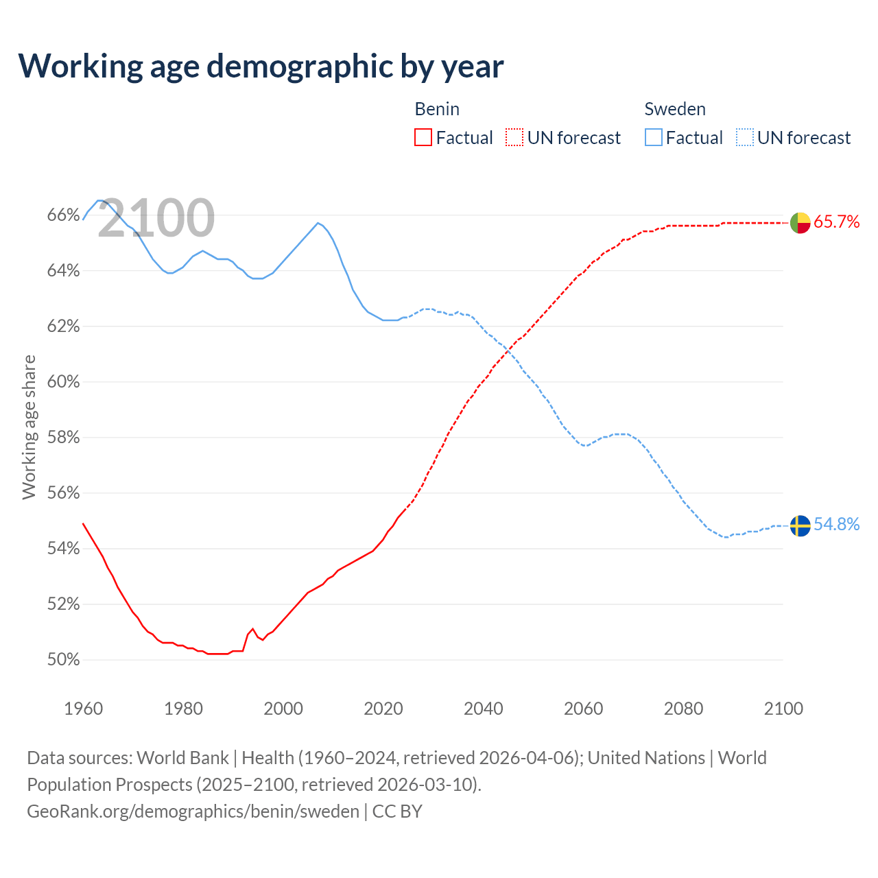 Median age Benin vs Sweden, 1960-2100