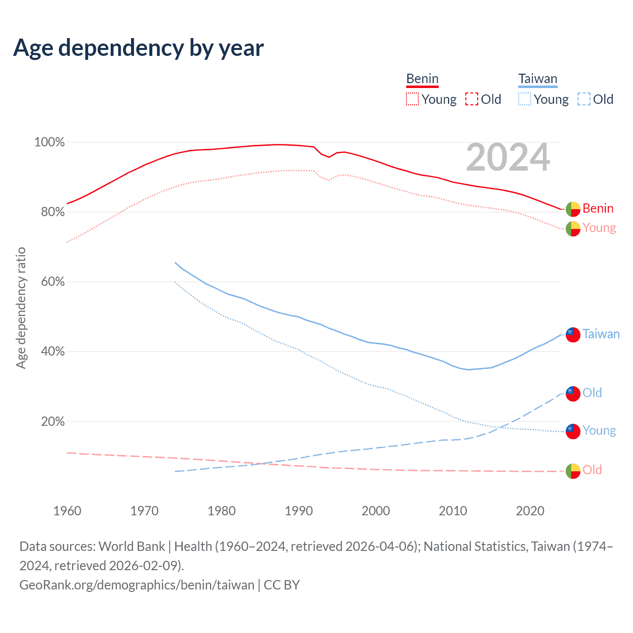 Data sources: World Bank | Health (1960–2024, retrieved 2026-04-06); U.S. Census Bureau (1960–2024, retrieved 2026-02-08); National Statistics, Taiwan (1974–2024, retrieved 2026-02-09).