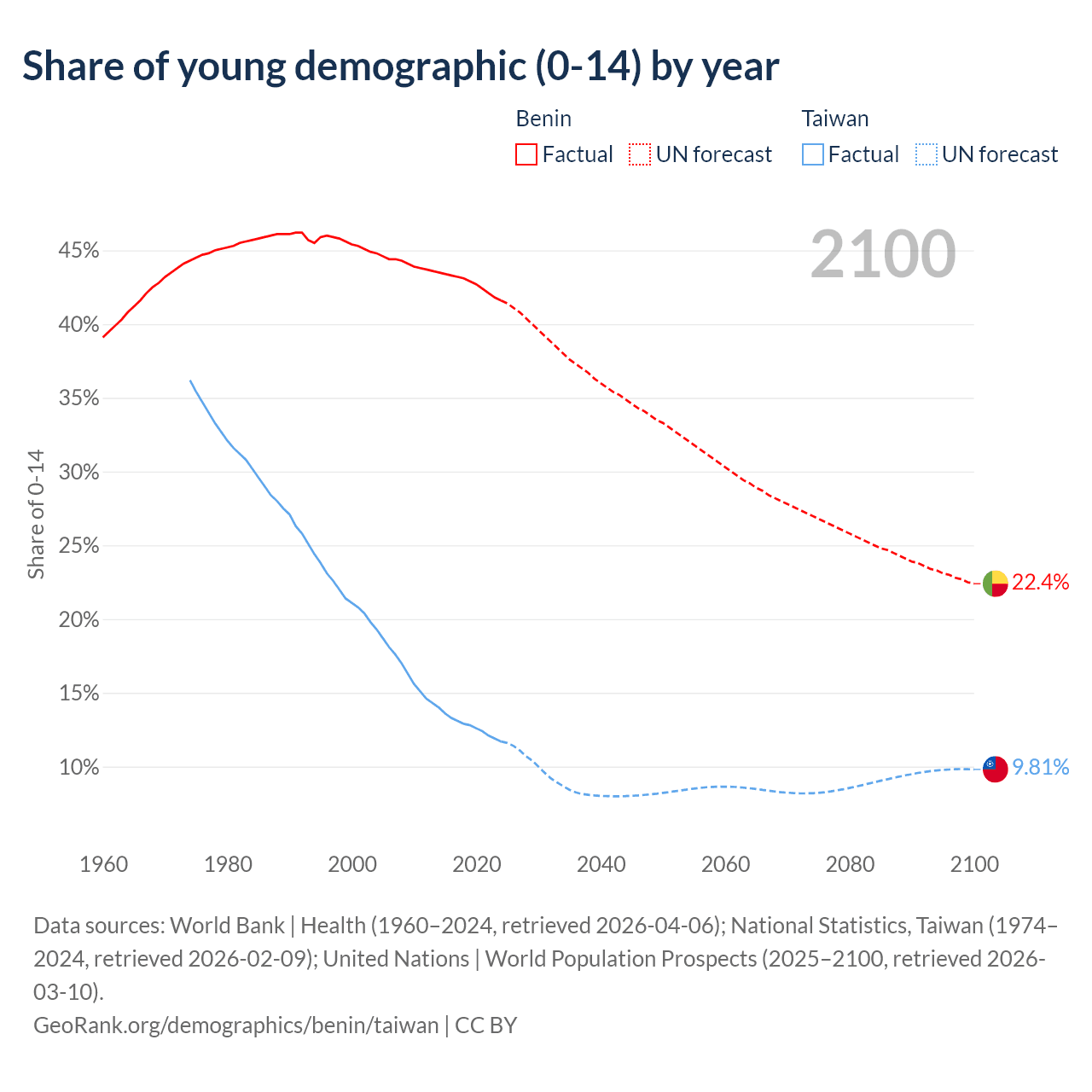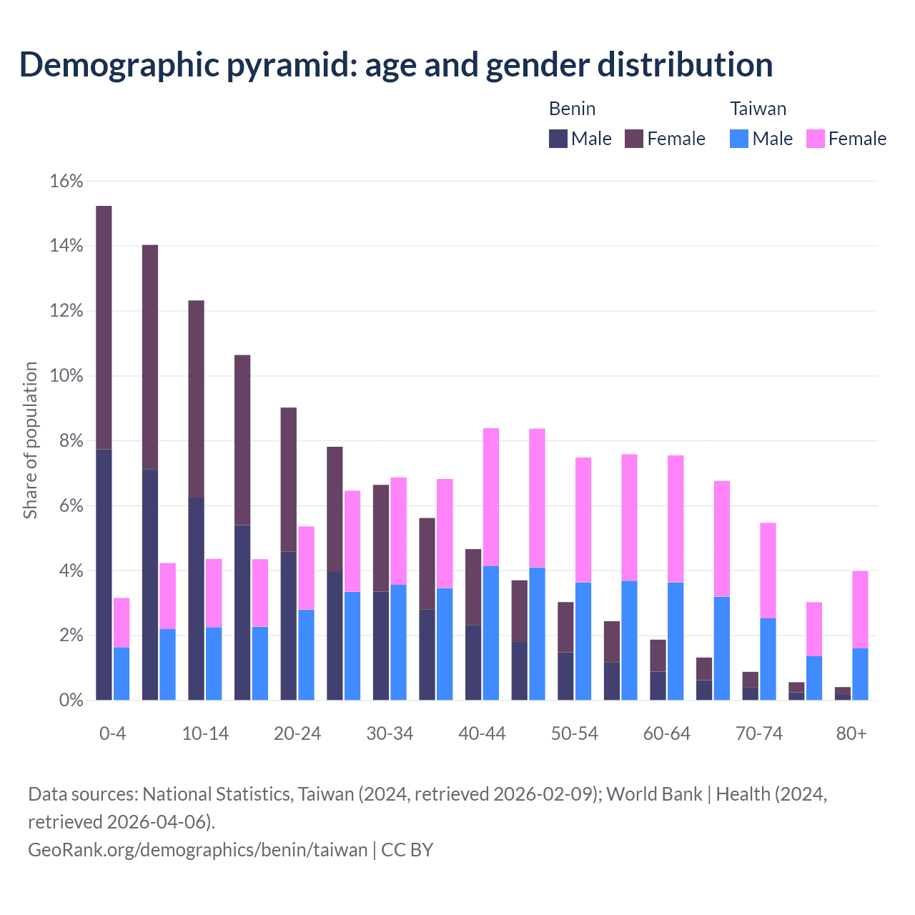 - The share of young demographic (0-15 years old) in Benin is 41.6% vs 11.7% in Taiwan.
