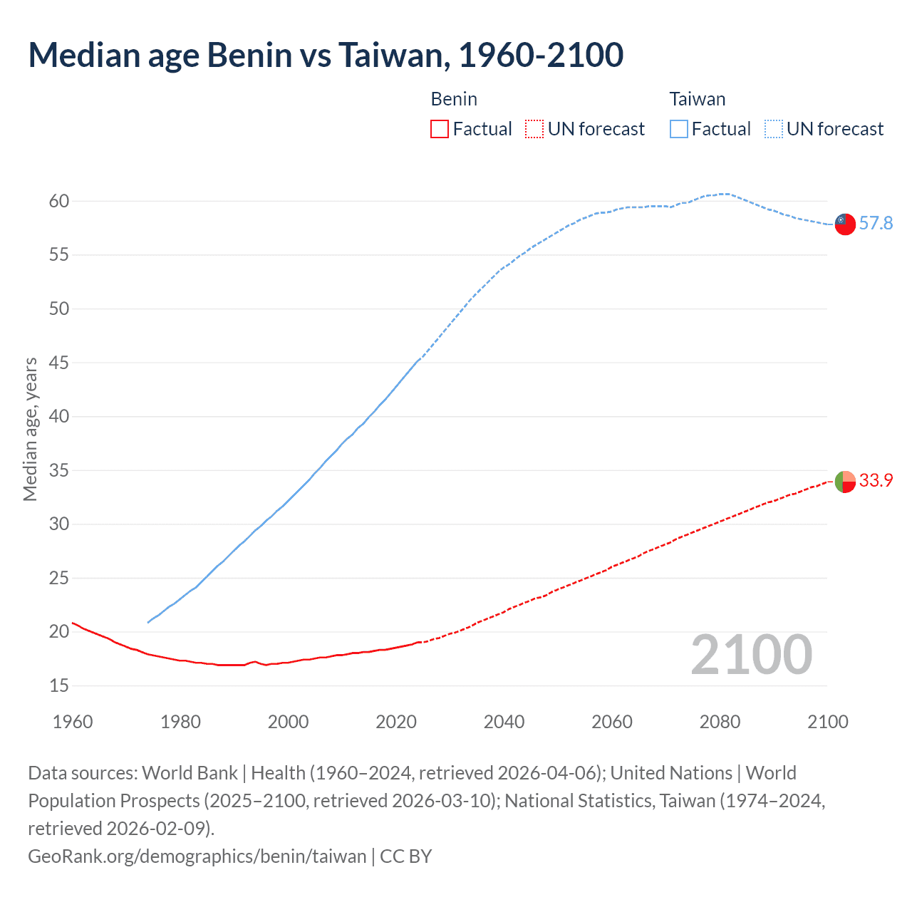 Median age Benin vs Taiwan, 1960-2100