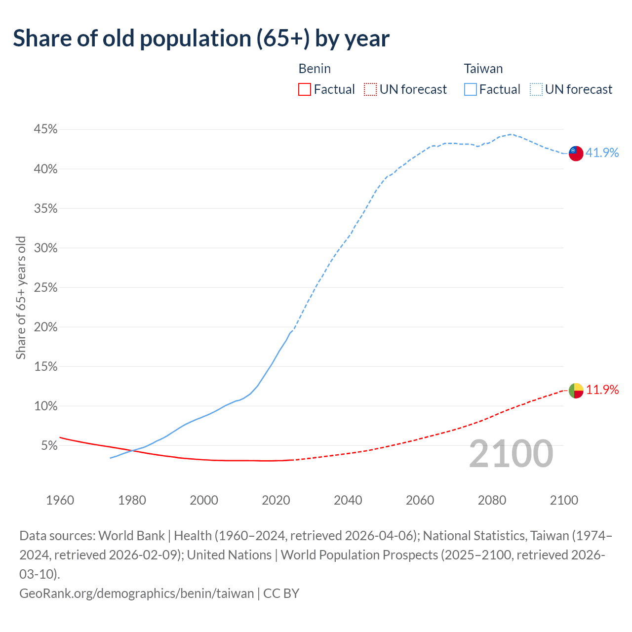 The share of older people aged 65 and over is 3.12% in Benin and 19.2% in Taiwan. Life expectancy in Benin compared to Taiwan .