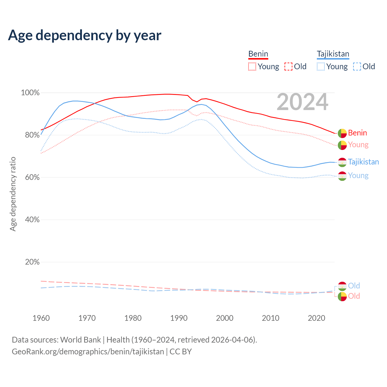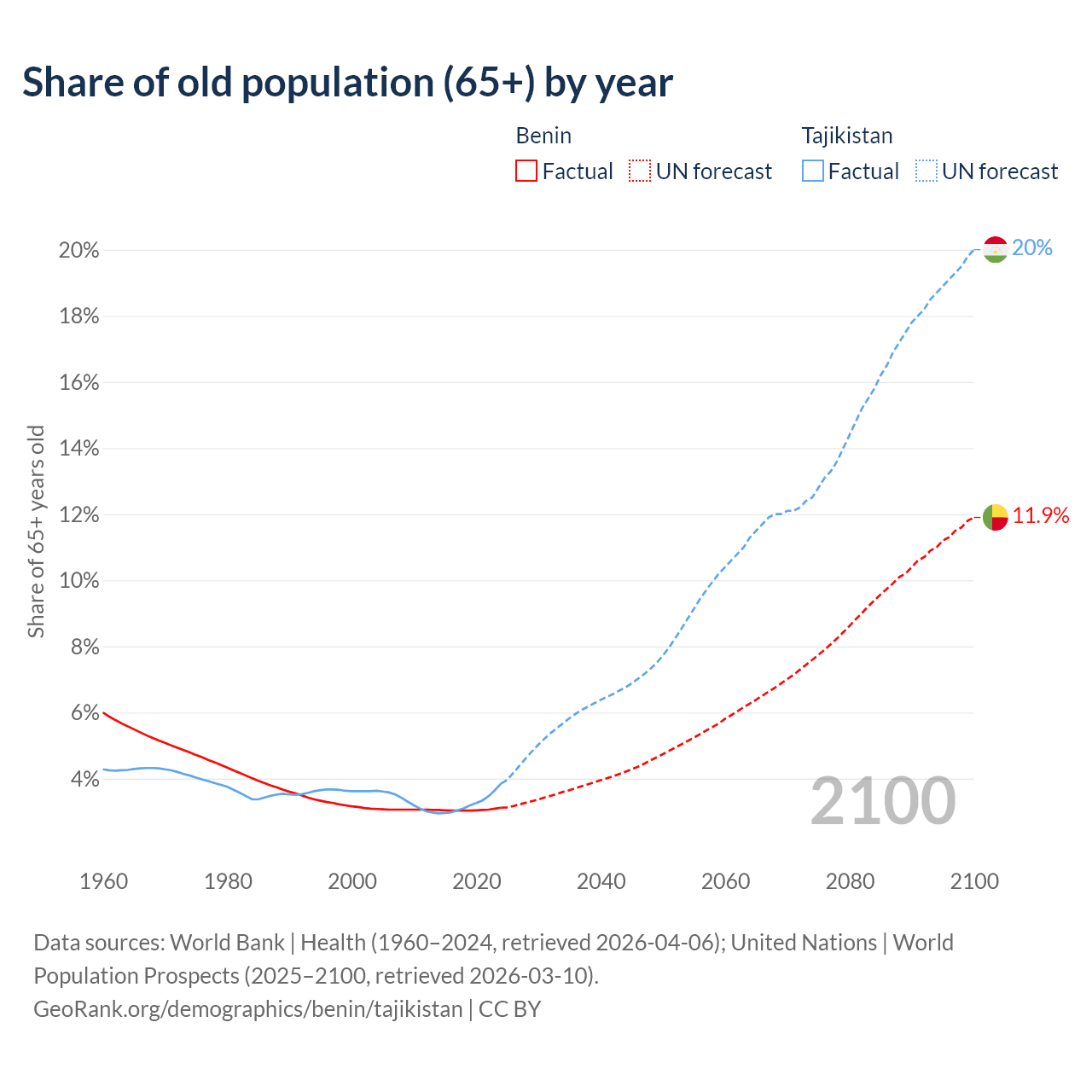 - The share of old-age demographic (65+) in Benin is 3.12% vs 3.85% in Tajikistan.
