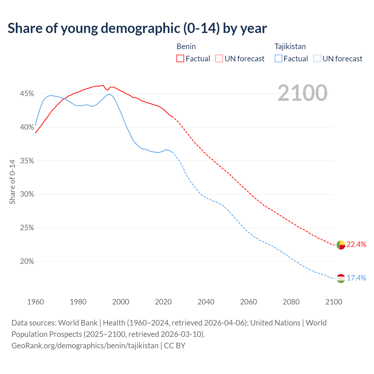- The share of young demographic (0-15 years old) in Benin is 41.6% vs 36.3% in Tajikistan.