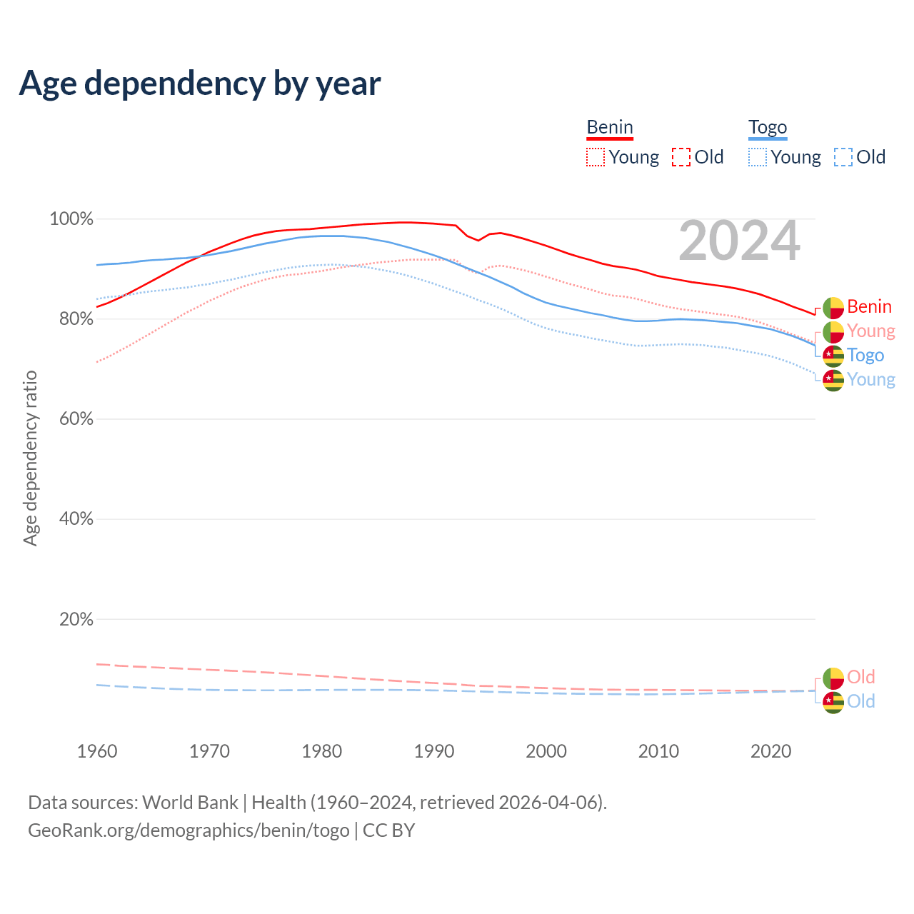 - Benin is ranked 179/196 by median age (oldest to youngest) vs 166/196 for Togo.
