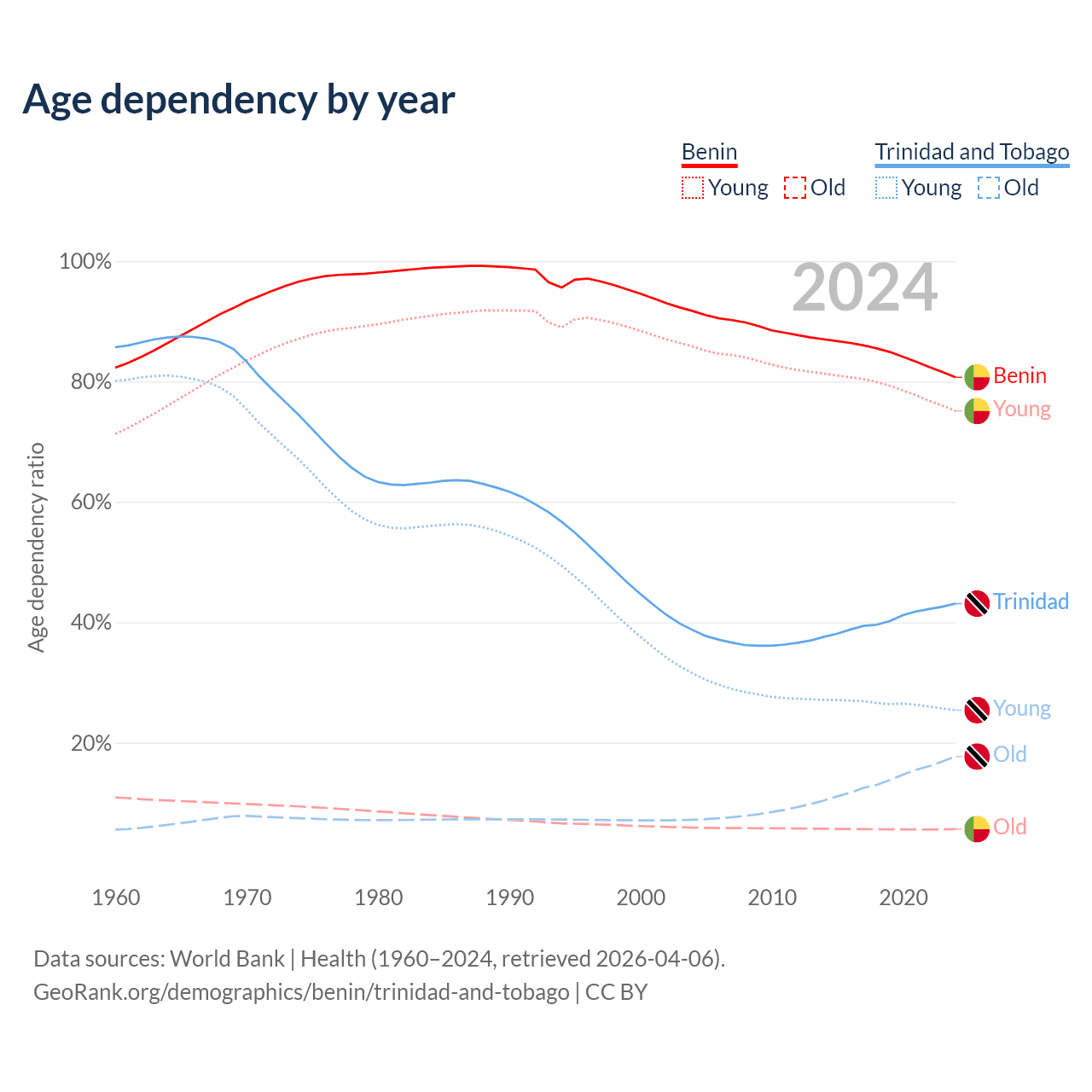 The share of older people aged 65 and over is 3.12% in Benin and 12.4% in Trinidad and Tobago. Life expectancy in Benin compared to Trinidad and Tobago .