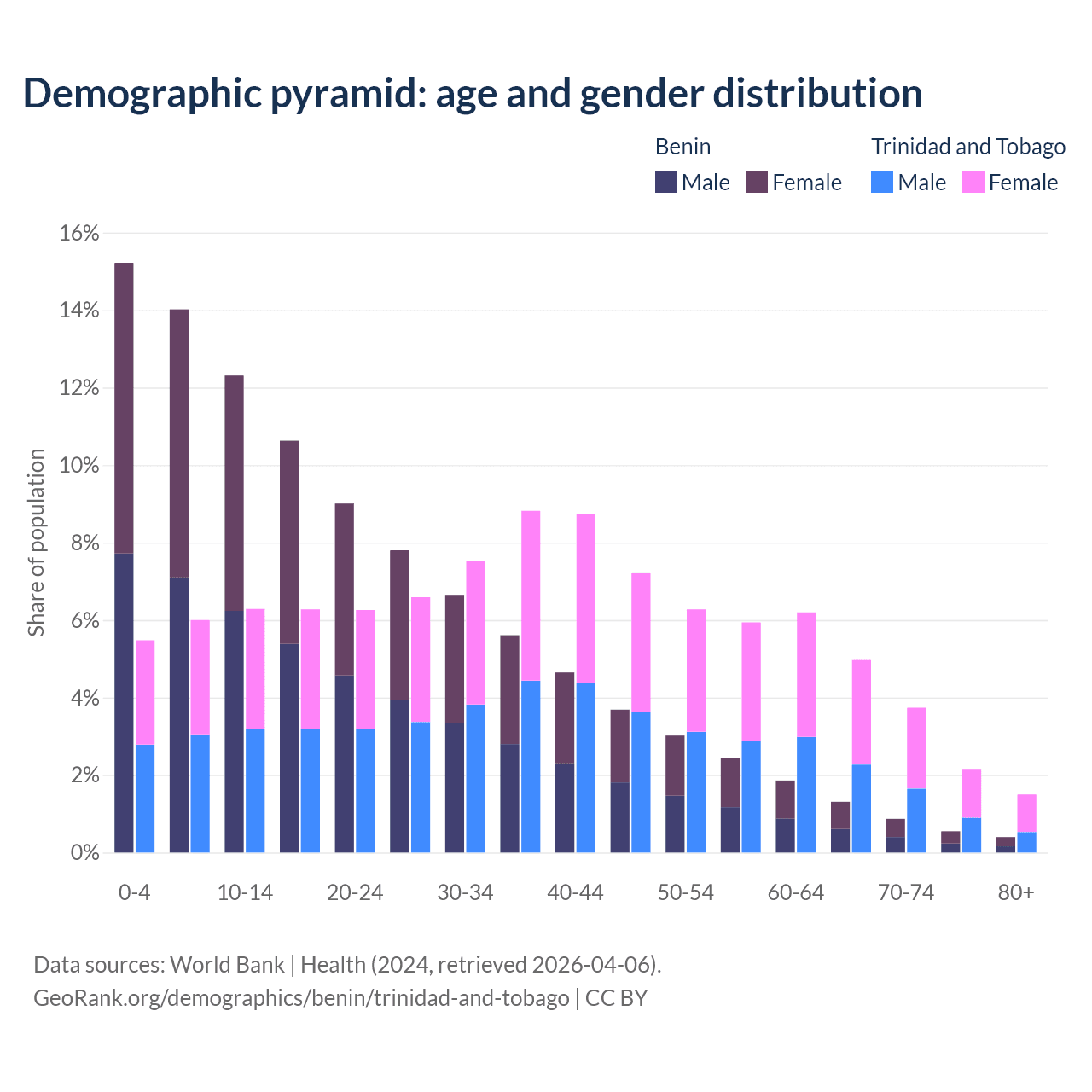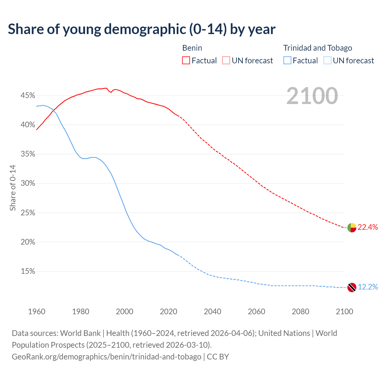 - The share of young demographic (0-15 years old) in Benin is 41.6% vs 17.8% in Trinidad and Tobago.