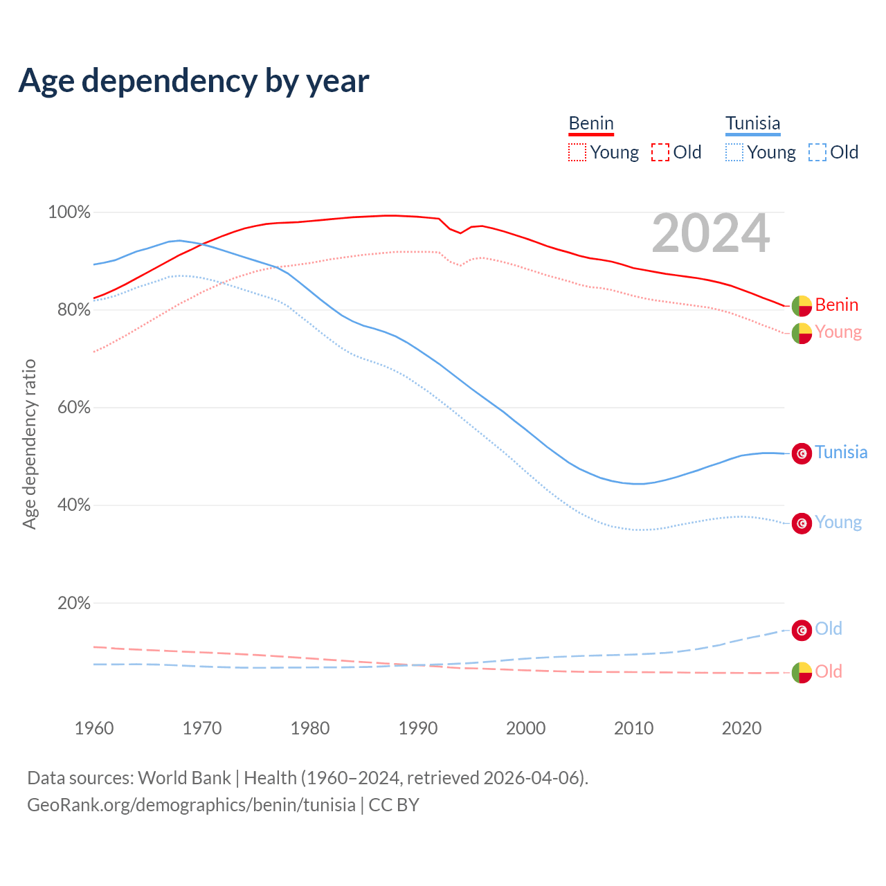 - Benin is ranked 179/196 by median age (oldest to youngest) vs 86/196 for Tunisia.