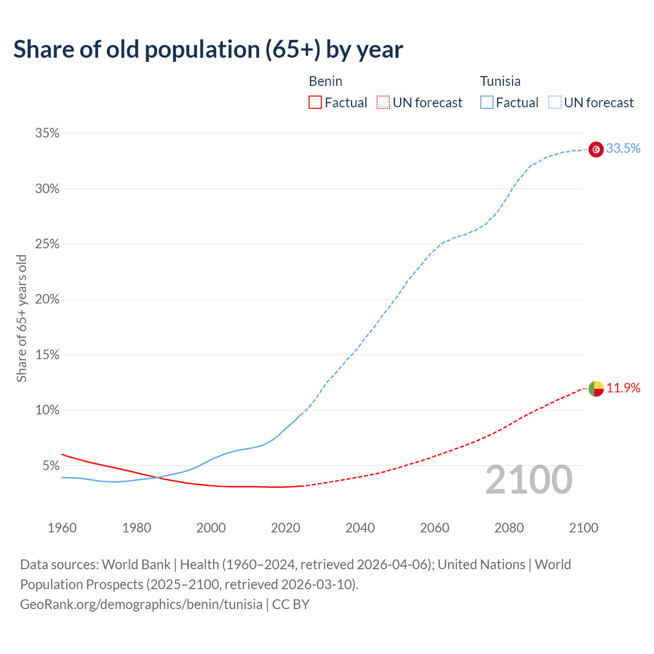 The share of older people aged 65 and over is 3.12% in Benin and 9.53% in Tunisia. Life expectancy in Benin compared to Tunisia .
