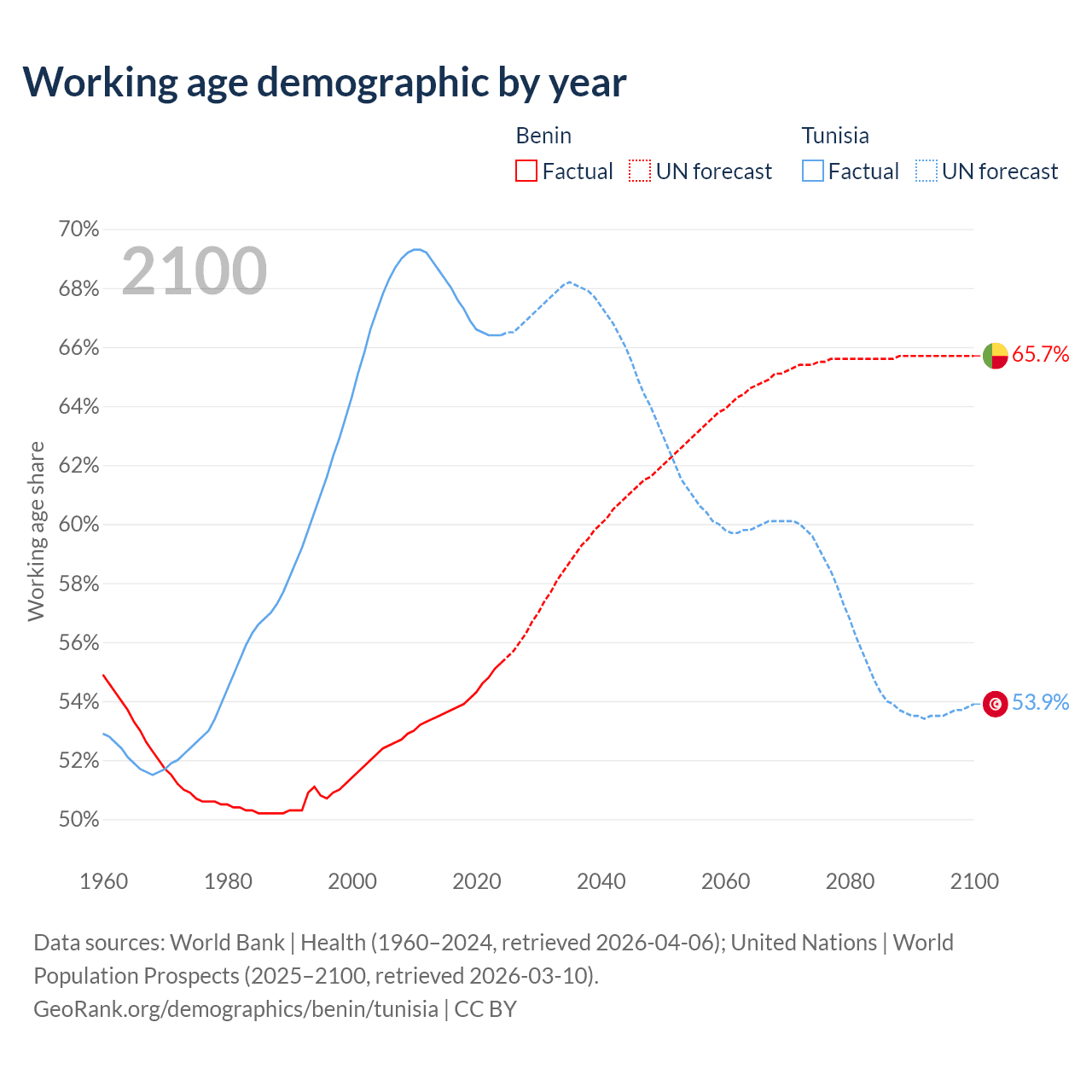 - Benin has 8.45M working age adults (aged 15-64) vs 8.26M in Tunisia.