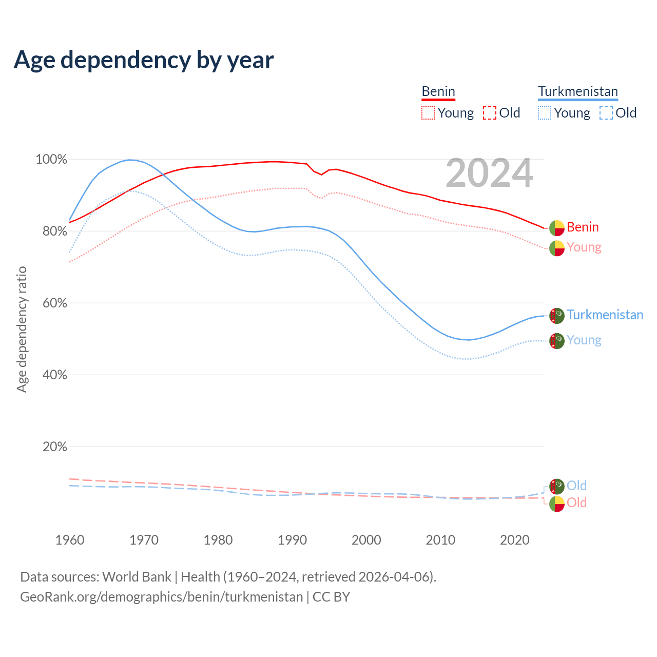 - Benin is ranked 179/196 by median age (oldest to youngest) vs 119/196 for Turkmenistan.