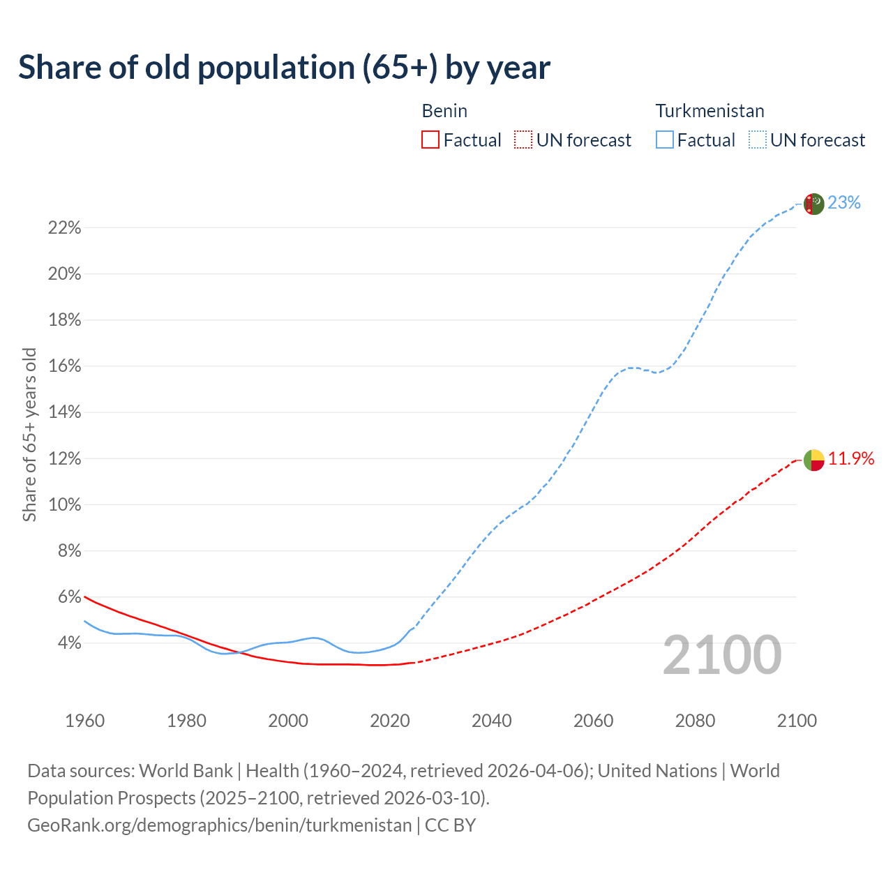 The share of older people aged 65 and over is 3.12% in Benin and 4.53% in Turkmenistan. Life expectancy in Benin compared to Turkmenistan .
