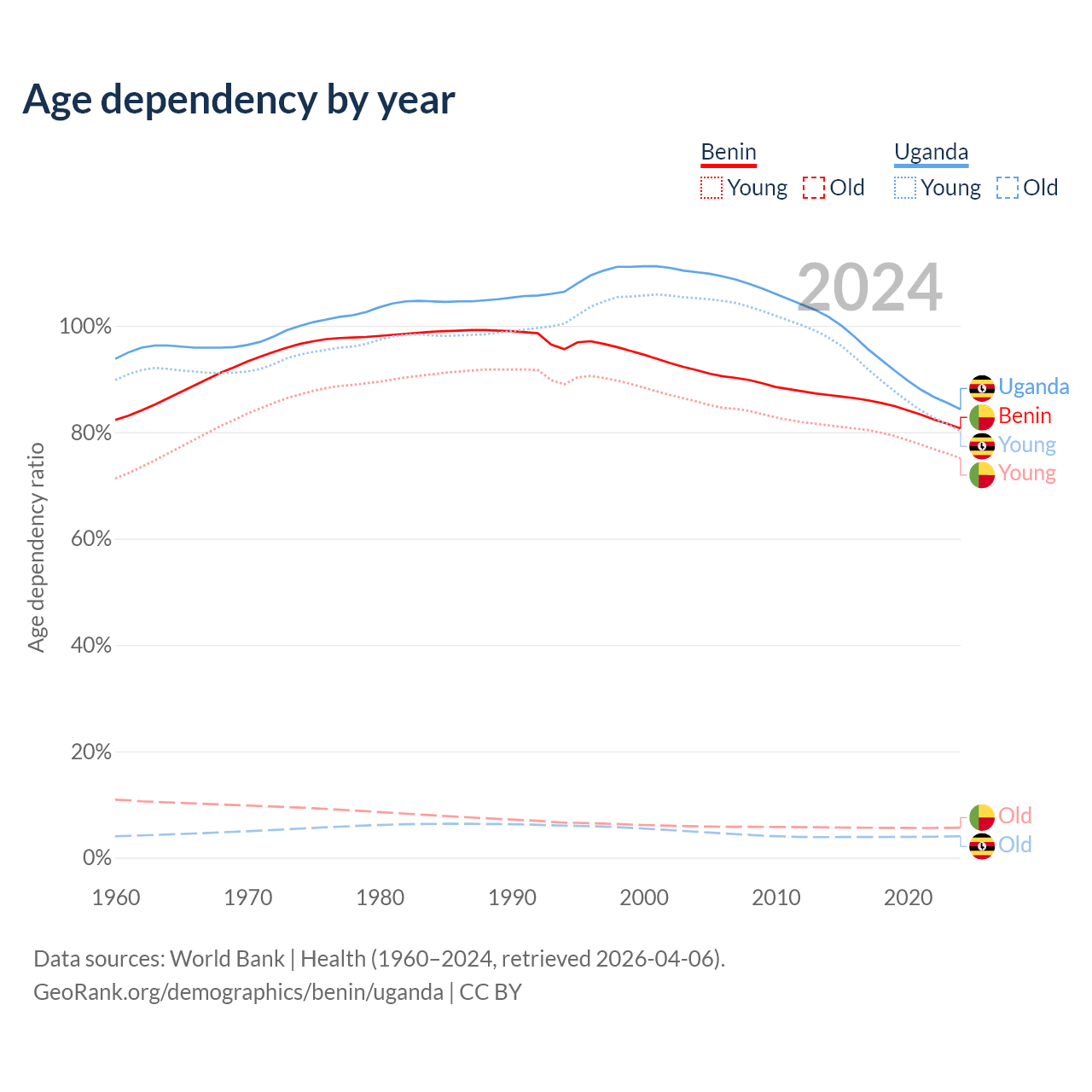 - Benin is ranked 179/196 by median age (oldest to youngest) vs 187/196 for Uganda.
