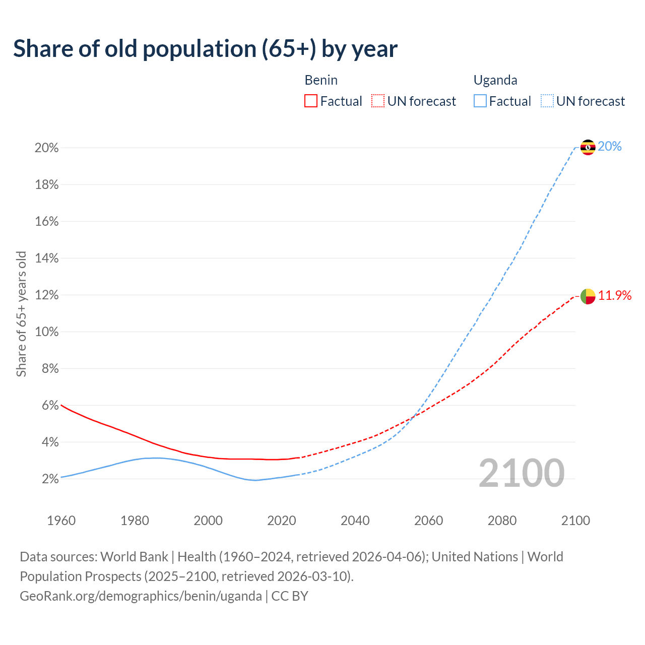 The share of older people aged 65 and over is 3.12% in Benin and 2.19% in Uganda. Life expectancy in Benin compared to Uganda .