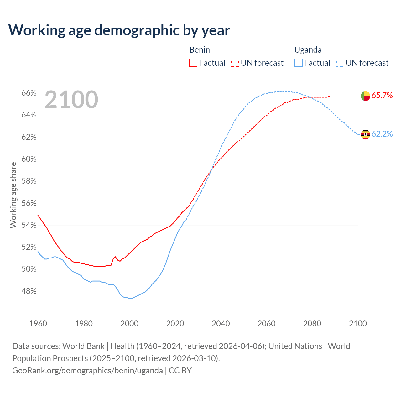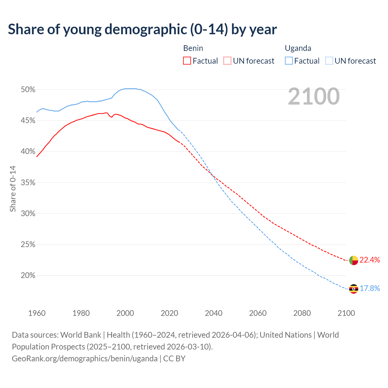 - As of 2026, the population of Benin is 15.3M vs 53.2M in Uganda - 3.48 times difference.