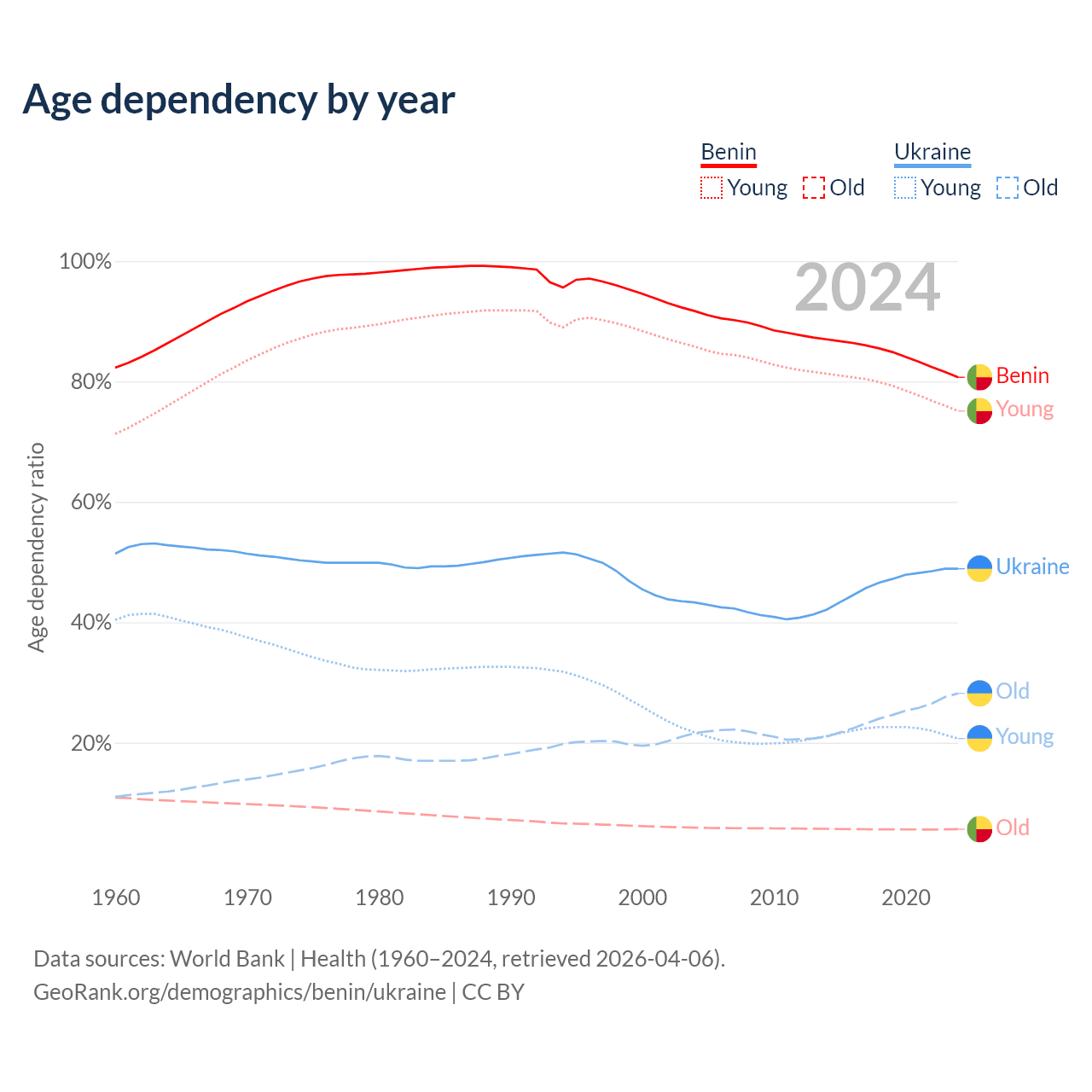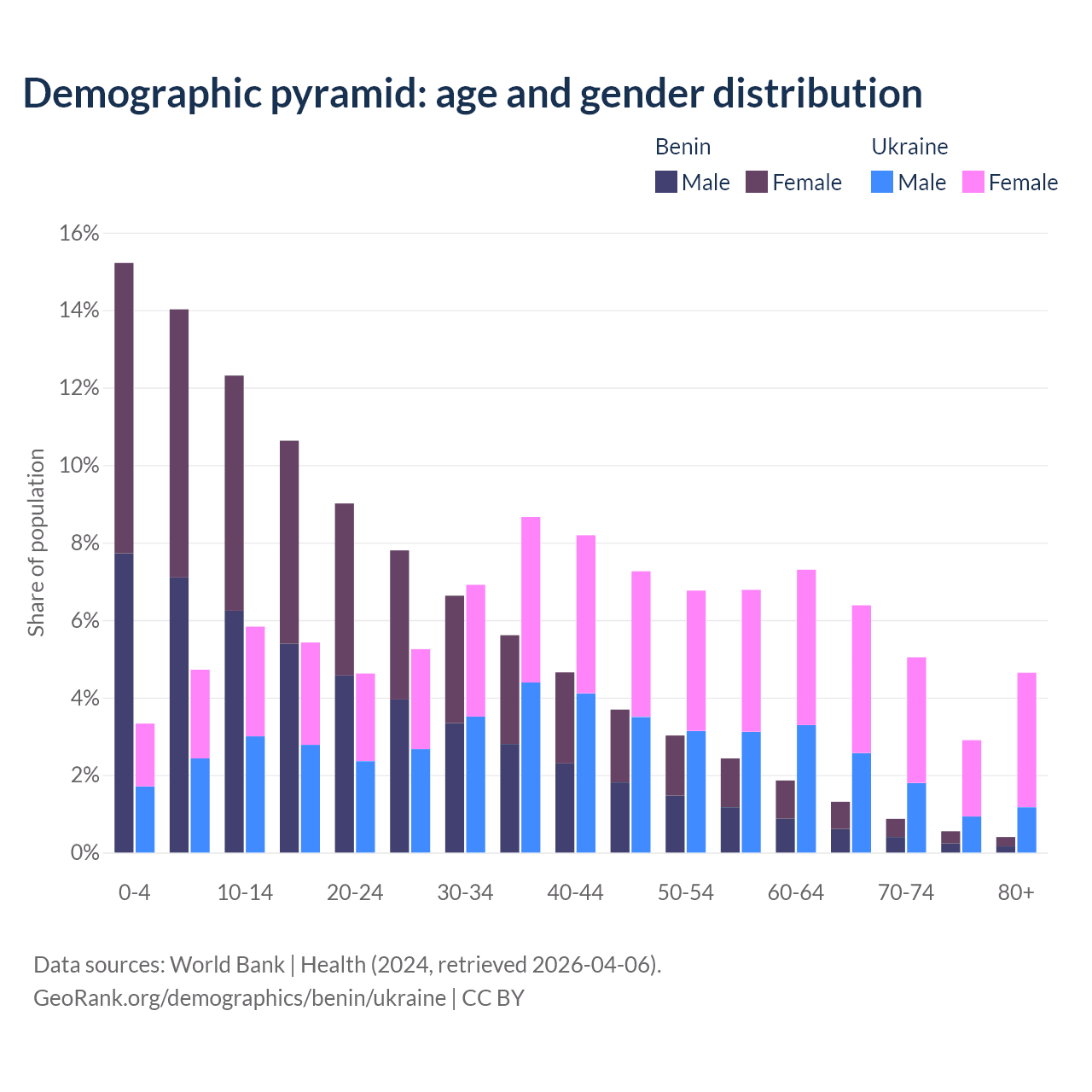 - Benin is ranked 179/196 by median age (oldest to youngest) vs 26/196 for Ukraine.