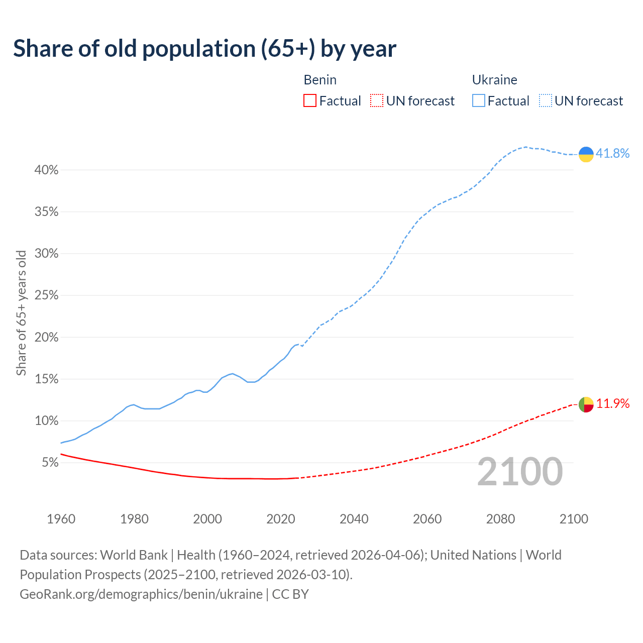 - The share of old-age demographic (65+) in Benin is 3.12% vs 19% in Ukraine.