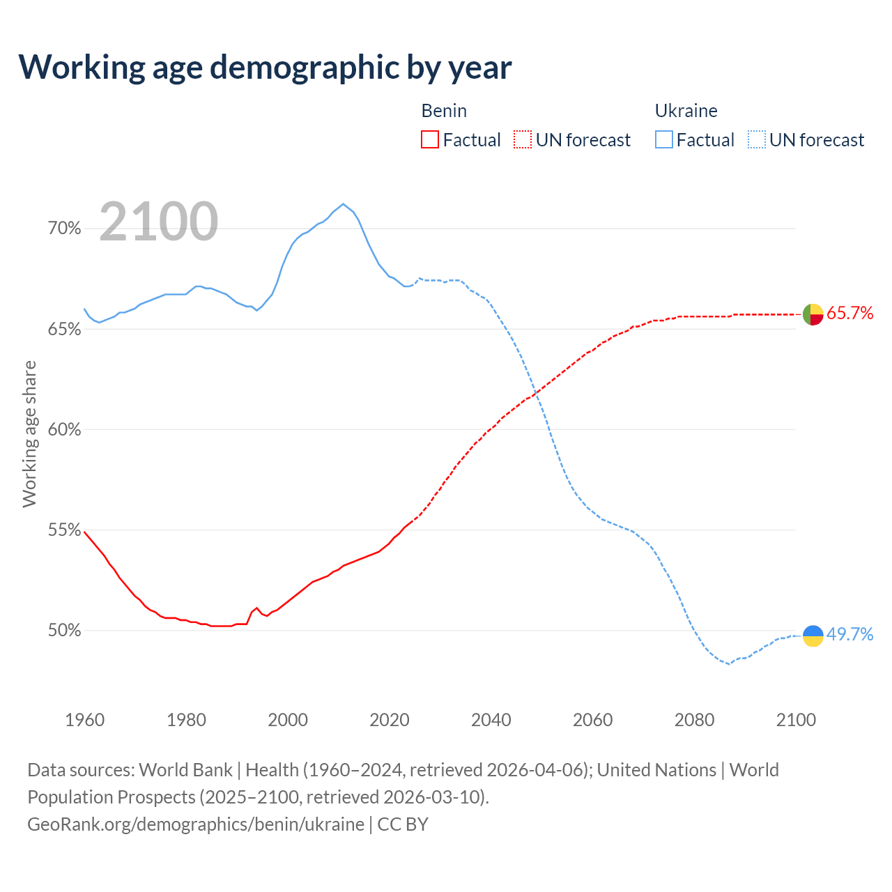 - Benin has 8.45M working age adults (aged 15-64) vs 26.9M in Ukraine.