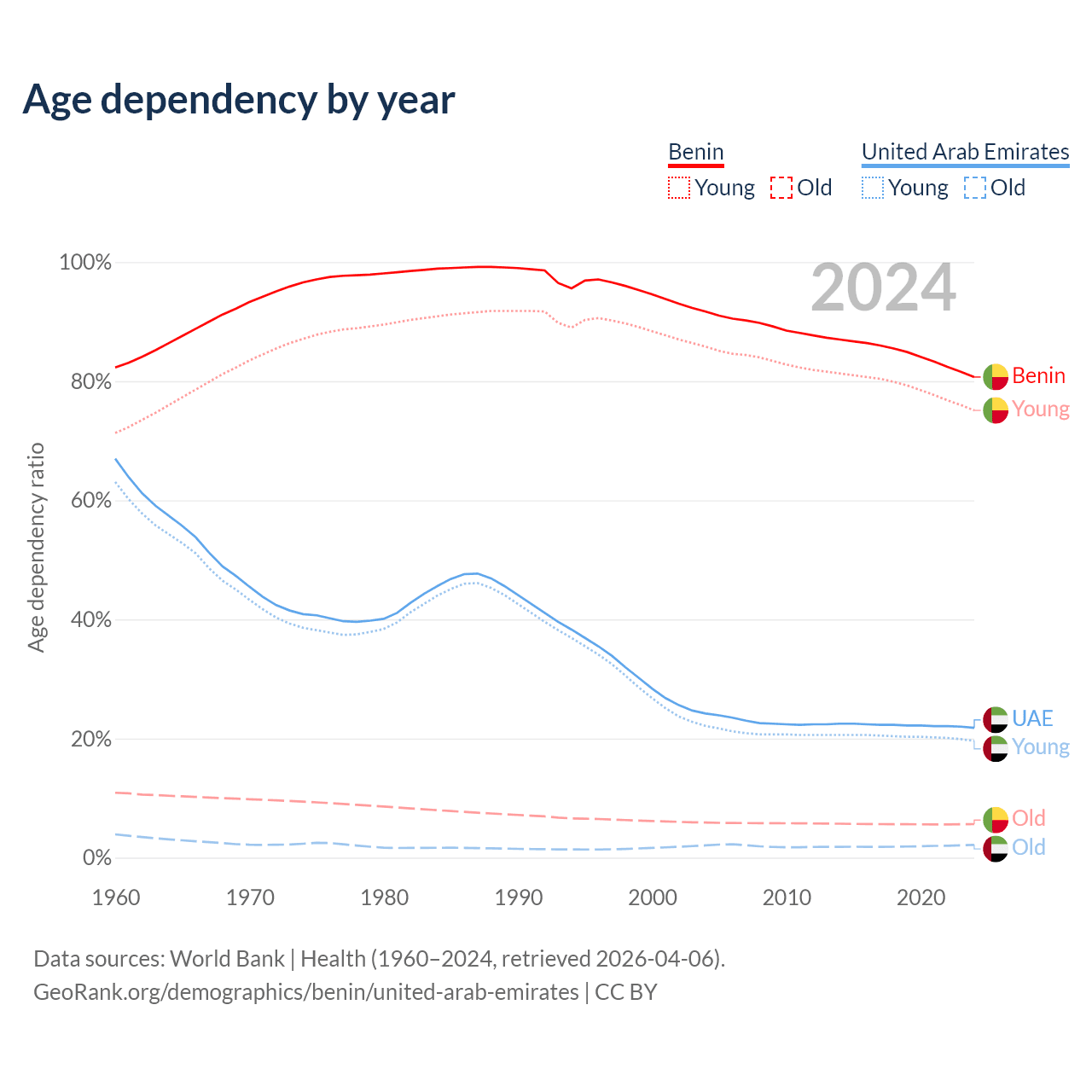 - The share of old-age demographic (65+) in Benin is 3.12% vs 1.77% in the United Arab Emirates.