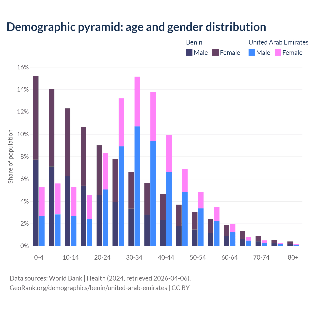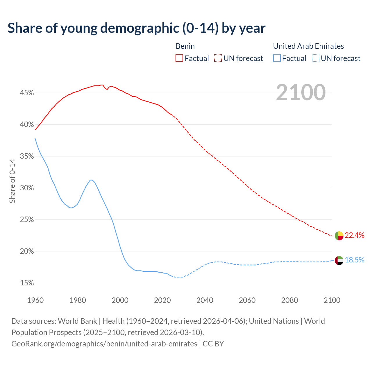 - The share of young demographic (0-15 years old) in Benin is 41.6% vs 16.1% in the United Arab Emirates.