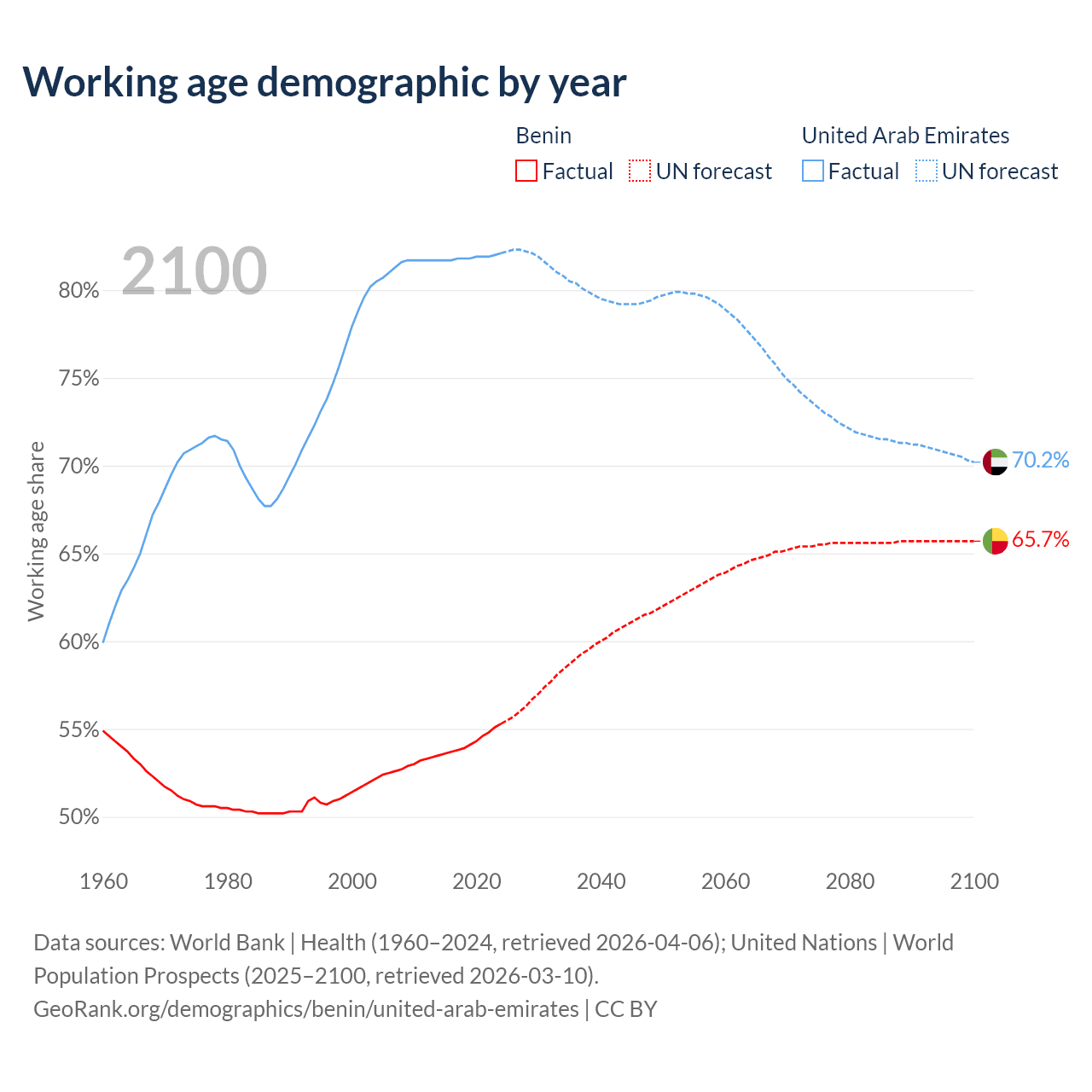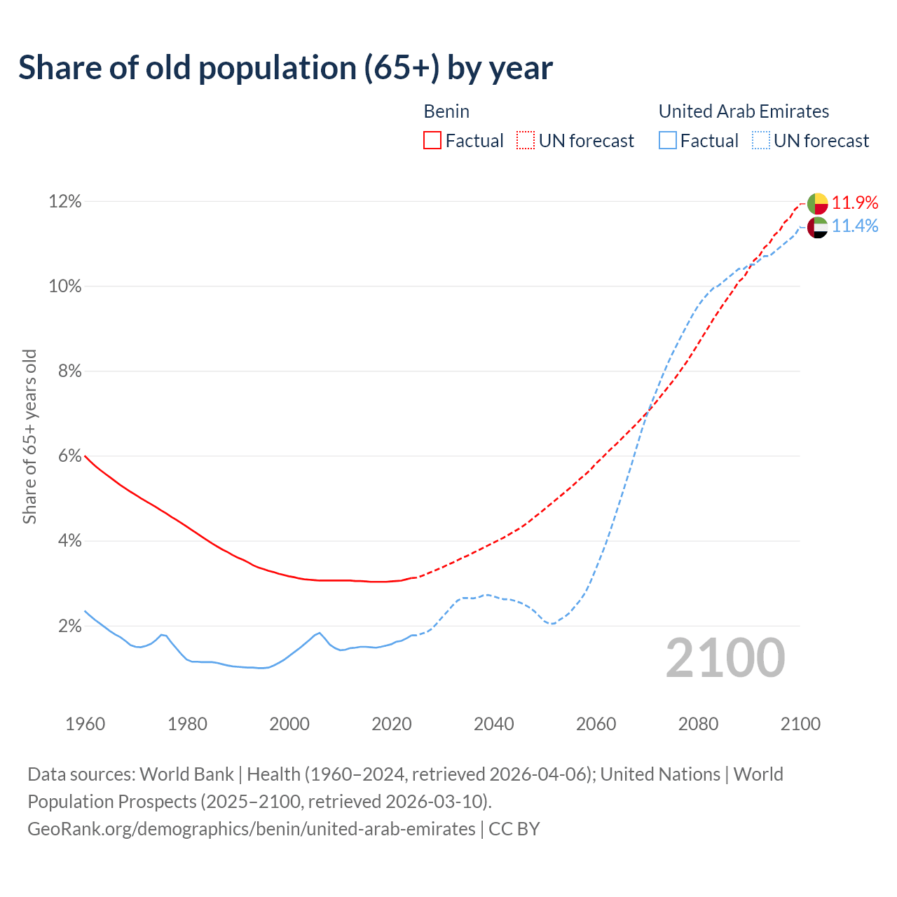 The share of older people aged 65 and over is 3.12% in Benin and 1.77% in the United Arab Emirates. Life expectancy in Benin compared to the United Arab Emirates .