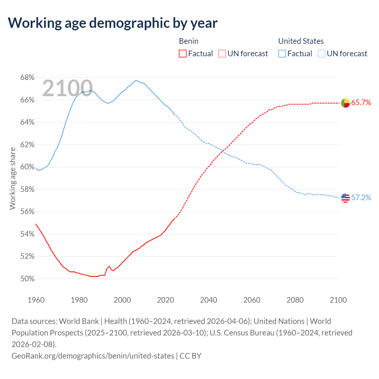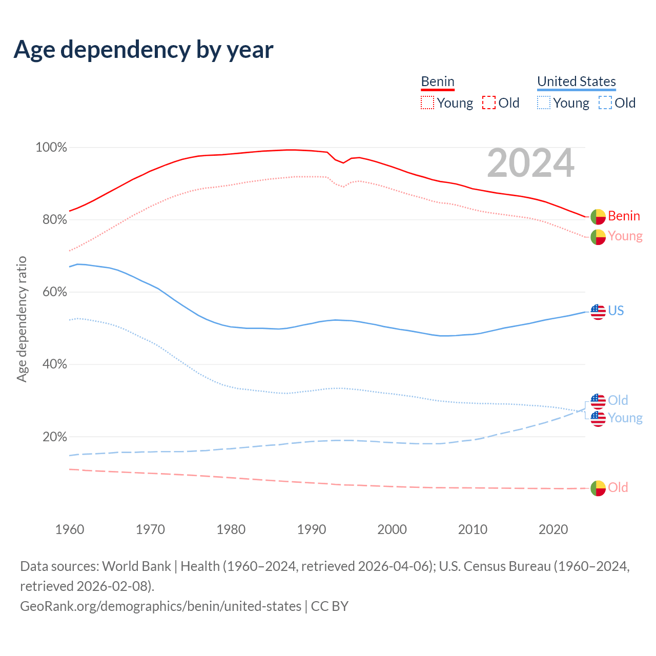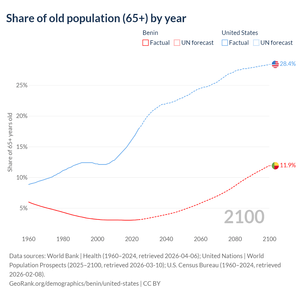 The share of older people aged 65 and over is 3.12% in Benin and 17.9% in the United States. Life expectancy in Benin compared to the United States .