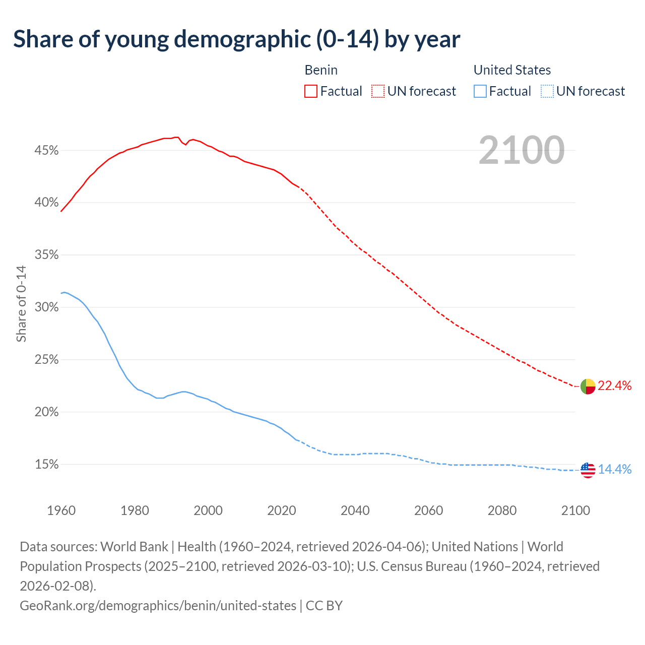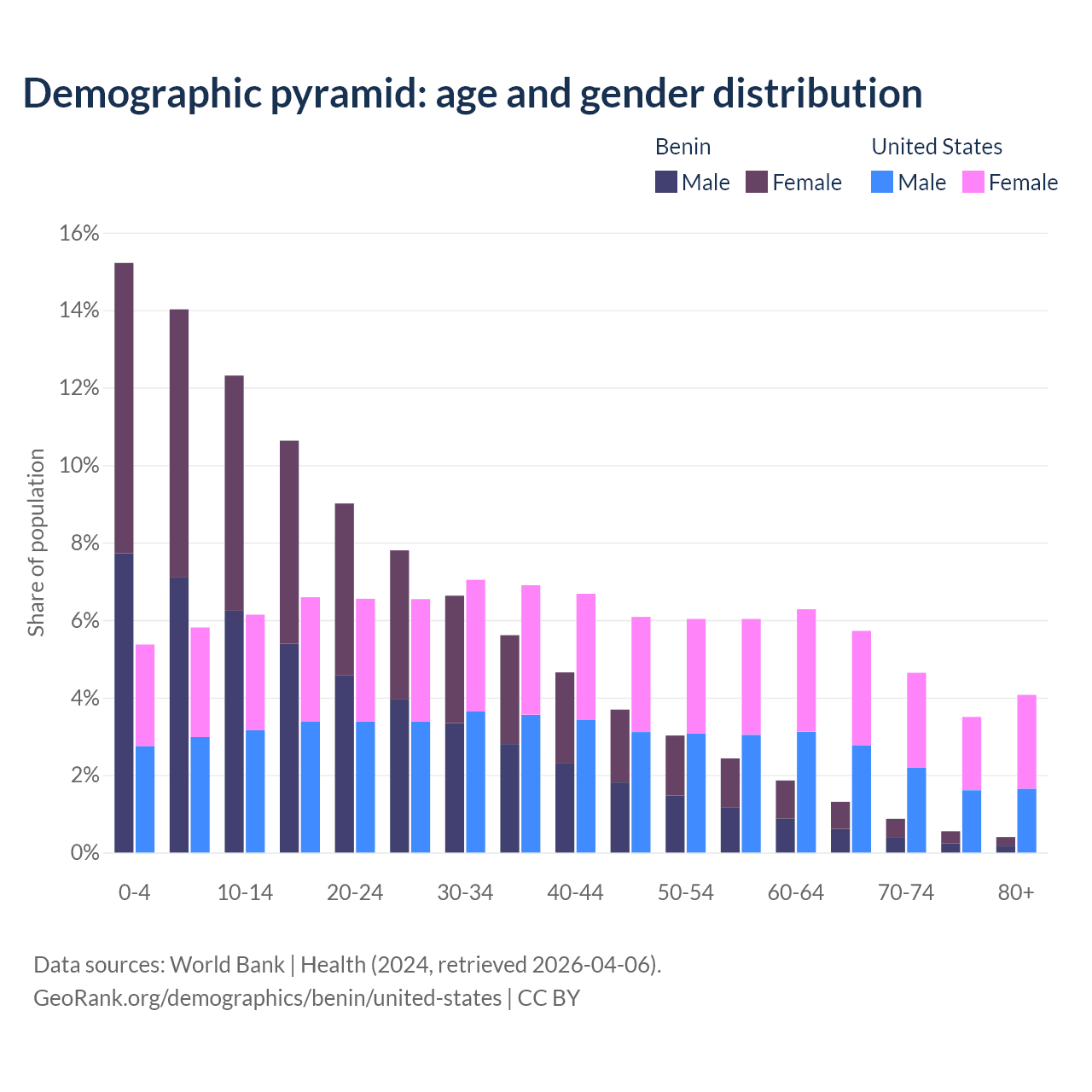 - The share of young demographic (0-15 years old) in Benin is 41.6% vs 17.3% in the United States.