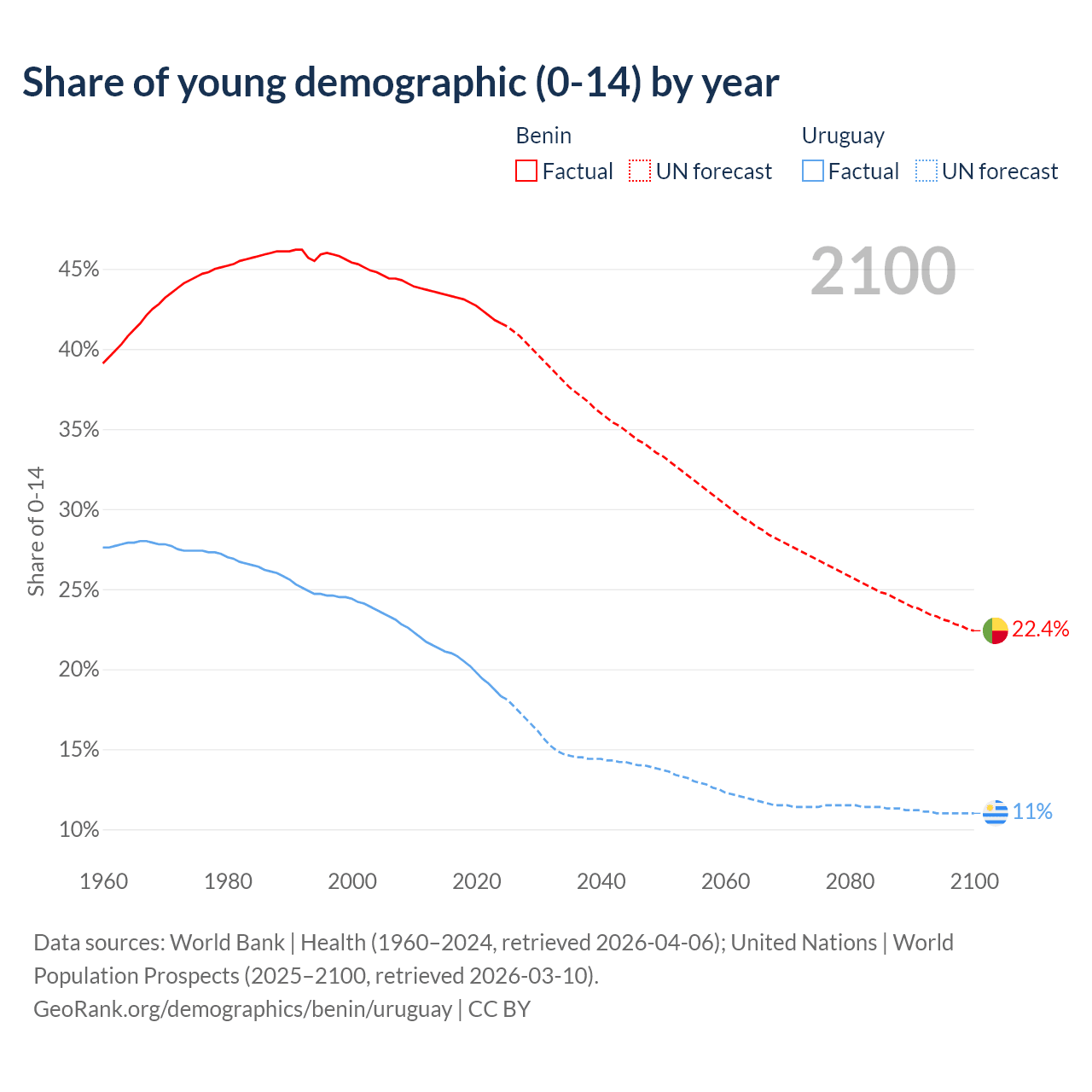 - The share of young demographic (0-15 years old) in Benin is 41.6% vs 18.3% in Uruguay.
