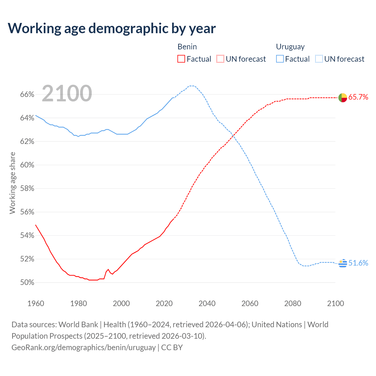 - Benin has 8.45M working age adults (aged 15-64) vs 2.22M in Uruguay.