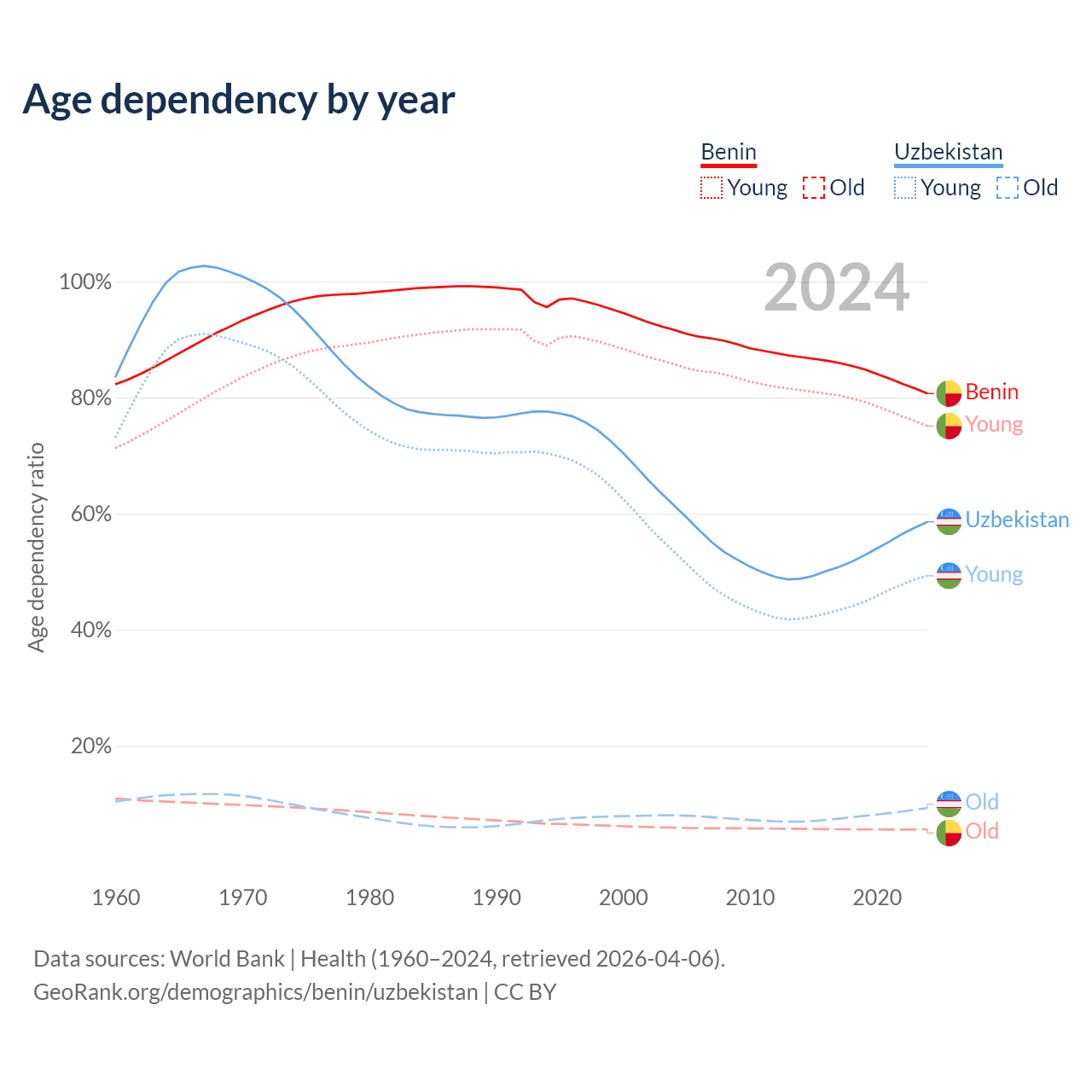 - Benin is ranked 179/196 by median age (oldest to youngest) vs 116/196 for Uzbekistan.