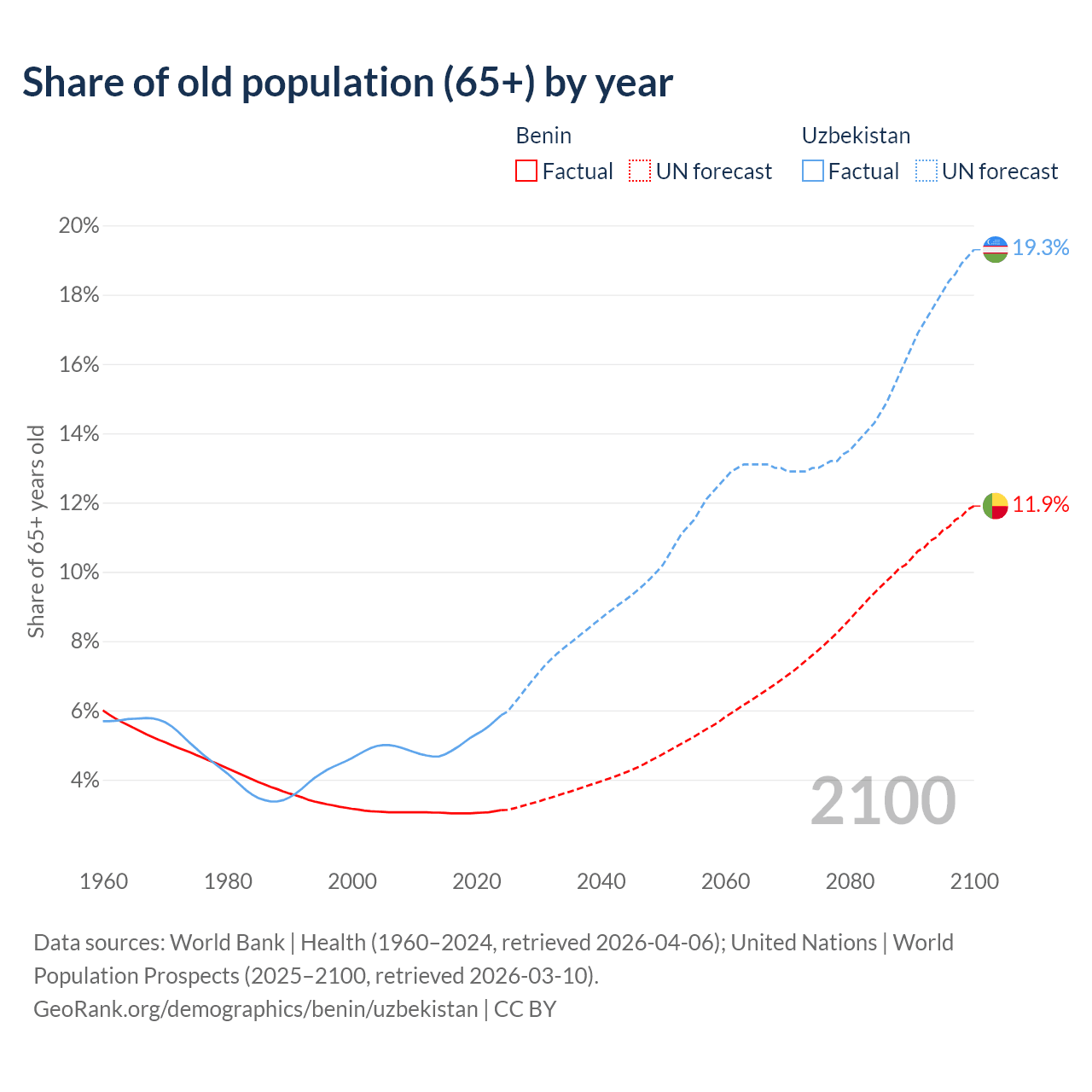 The share of older people aged 65 and over is 3.12% in Benin and 5.86% in Uzbekistan. Life expectancy in Benin compared to Uzbekistan .