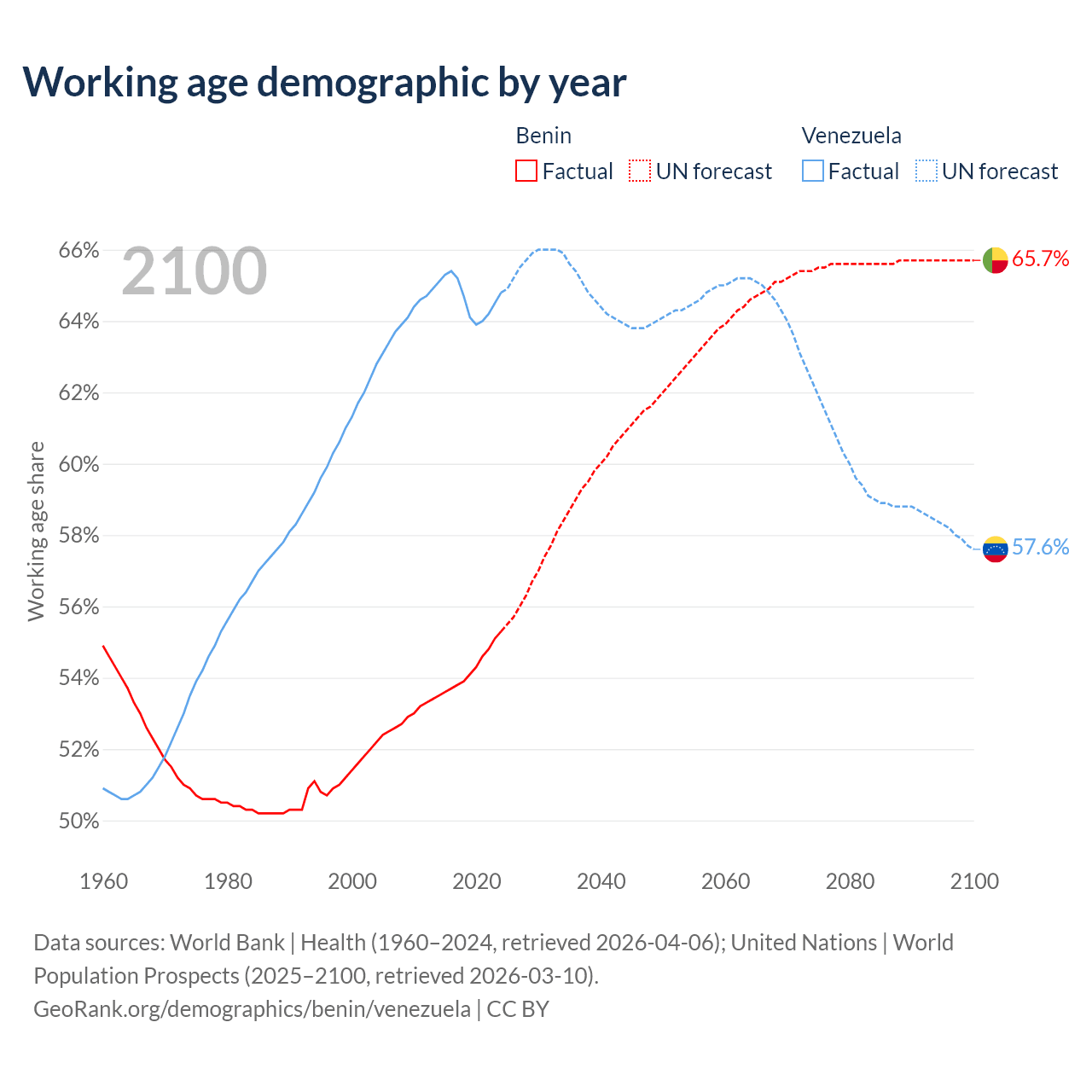 - Benin has 8.45M working age adults (aged 15-64) vs 18.6M in Venezuela.