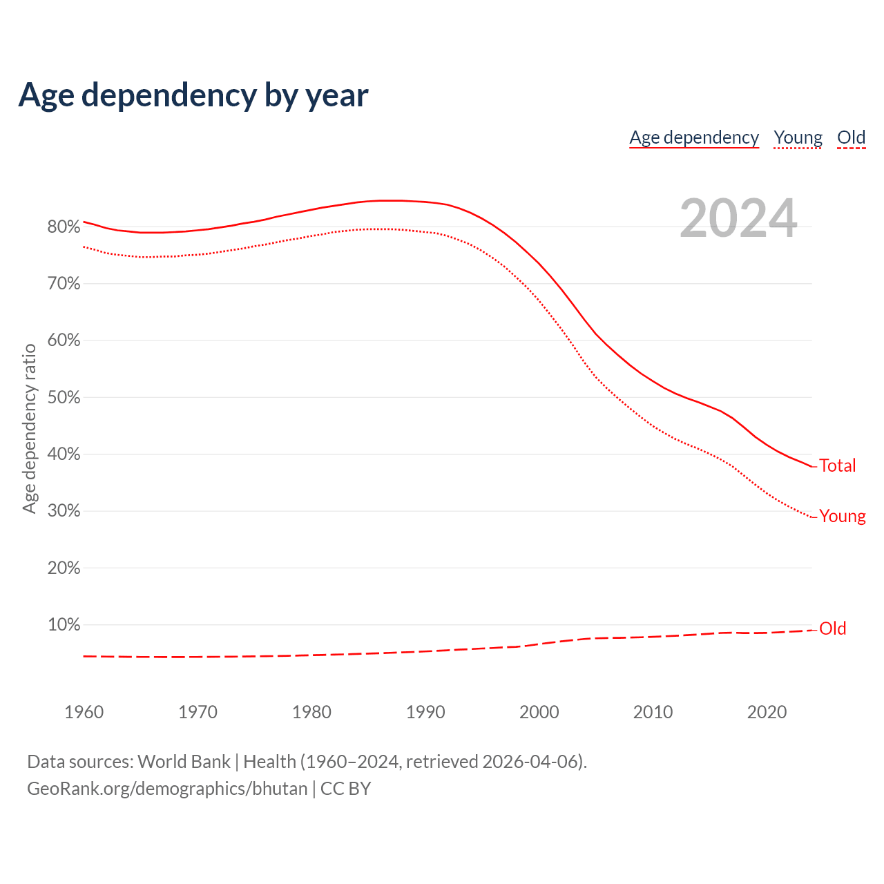 Data sources: World Bank | Health (1960–2024, retrieved 2026-04-06); U.S. Census Bureau (1960–2024, retrieved 2026-02-08).