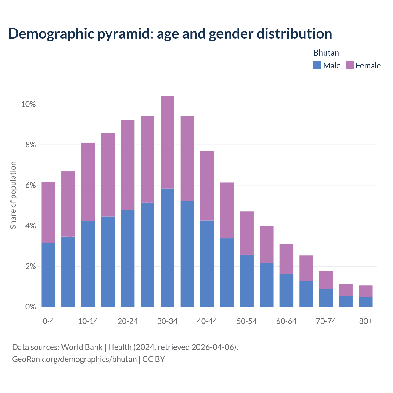 With a population of 792K people, Bhutan has a median age of 30.9 years which makes it the 95/196 oldest country. 20.9% of the demographic are children 0-14 years old, 72.6% are working-age people aged 15-64, and 6.49% are older population aged 65+ years.